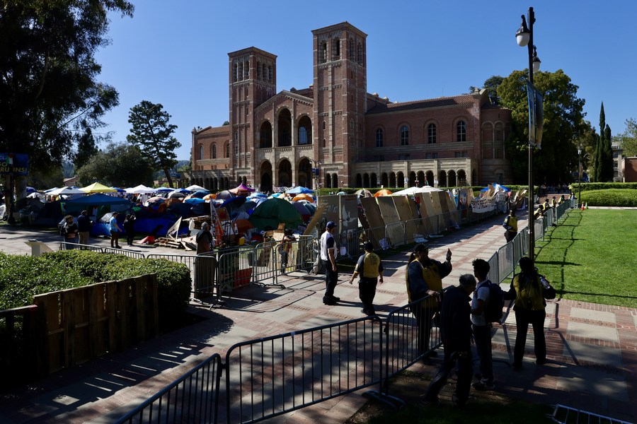 In this photo taken on April 28, 2024, the pro-Palestine encampment on school campus is closed and all entrances to that area are blocked at the University of California, Los Angeles (UCLA), in California, the United States. (Photo: Xinhua)