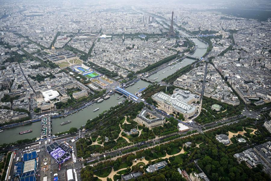 This photo taken from a helicopter on July 26, 2024, shows an aerial view of the Eiffel Tower (rear C) and the Grand Palais (front R) during the opening ceremony of the Paris 2024 Olympic Games in Paris, France. (Photo: Xinhua)