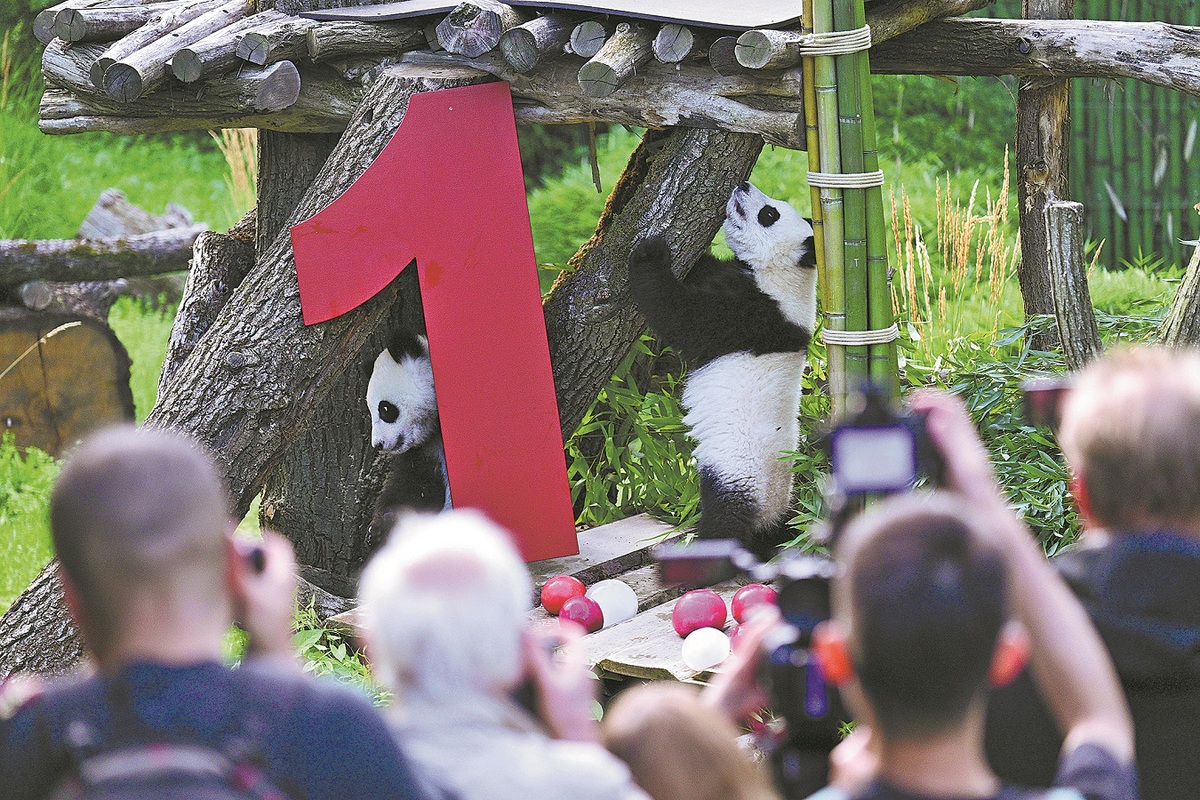 Visitors photograph panda twins Meng Hao and Meng Tian, or Leni and Lotti, during their first birthday party at Berlin Zoological Garden in Berlin, Germany, on Aug 22. (Photo: AP)