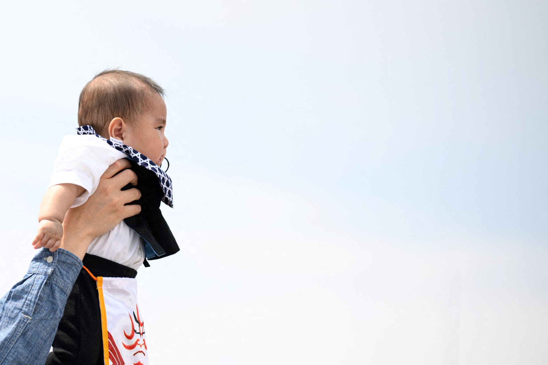 A parent holds his child before the start of the "crying baby sumo" match at the Sensoji temple in Tokyo on April 26, 2025. (File photo: AFP)