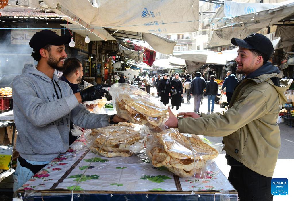 A customer purchases Naem cake, a Syrian traditional sweet, during the holy month of Ramadan in Damascus, Syria, Feb. 26, 2026. (Photo by Ammar Safarjalani/Xinhua)