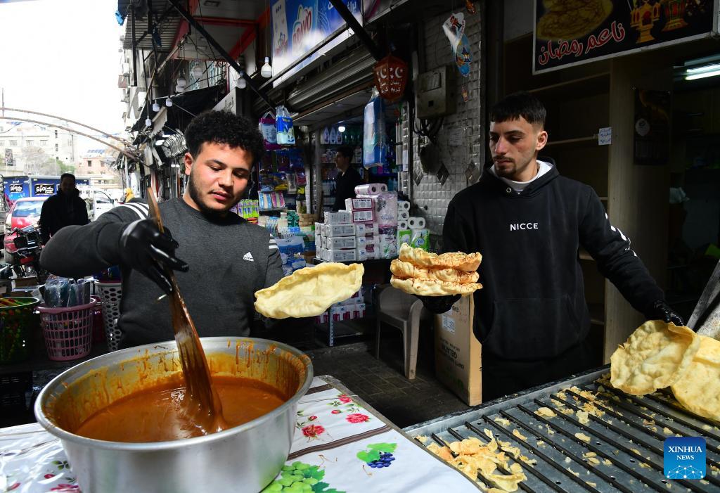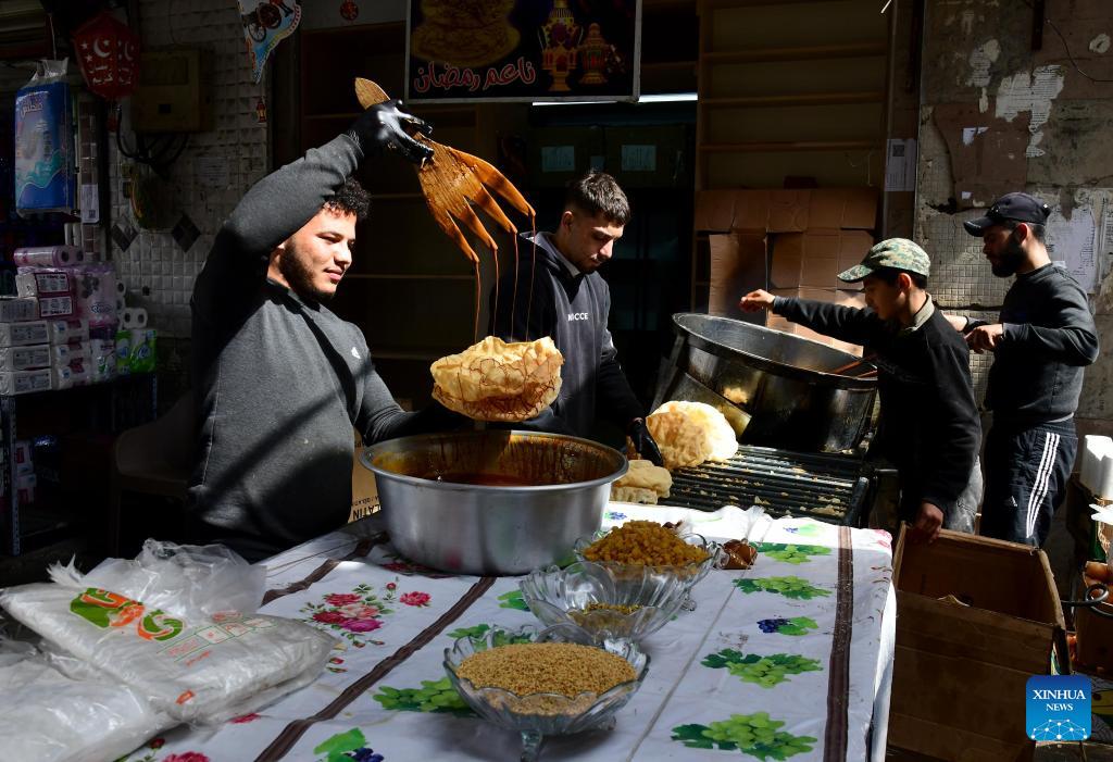 A Syrian confectioner prepares Naem cake, a Syrian traditional sweet, during the holy month of Ramadan in Damascus, Syria, Feb. 26, 2026. (Photo by Ammar Safarjalani/Xinhua)