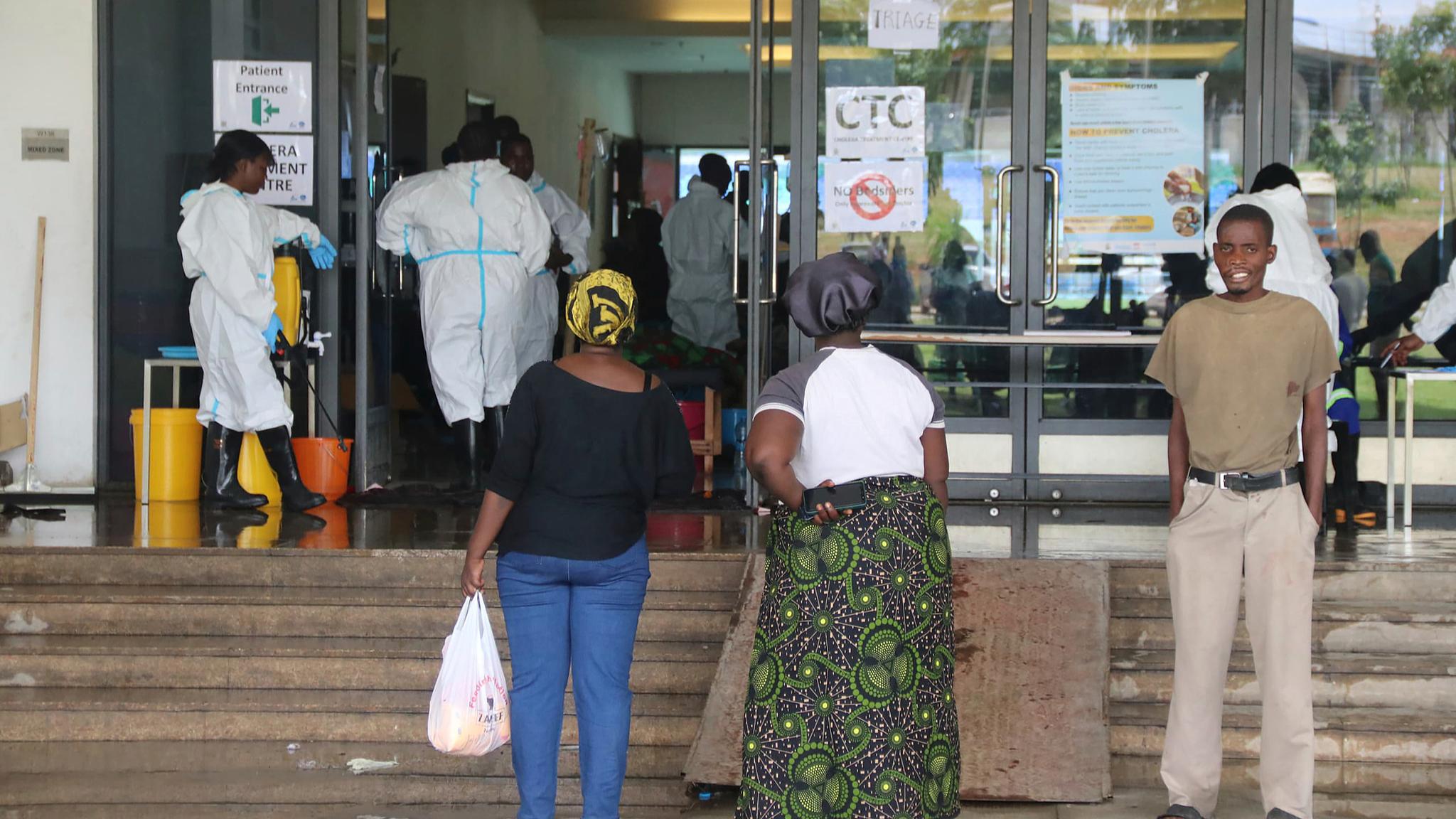 People wait outside a cholera treatment center in Lusaka, Zambia, January 12, 2024. /CFP