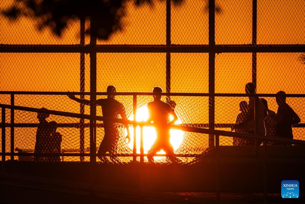 People play basketball at sunset in Znjan, Croatia, Feb. 27, 2026. (Zvonimir Barisin/PIXSELL via Xinhua)
