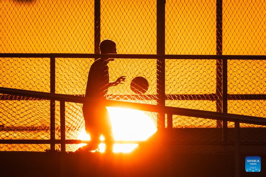 A man plays basketball at sunset in Znjan, Croatia, Feb. 27, 2026. (Zvonimir Barisin/PIXSELL via Xinhua)
