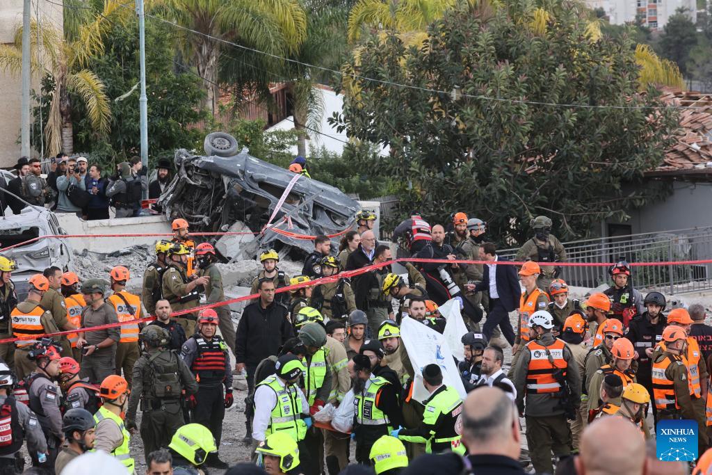 This photo taken on March 1, 2026 shows the site of a missile strike in Beit Shemesh, west of Jerusalem. Eight people were killed and at least 23 were injured on Sunday when an Iranian missile struck a residential area in Beit Shemesh, west of Jerusalem, according to local media reports. (Photo by Gil Cohen Magen/Xinhua)