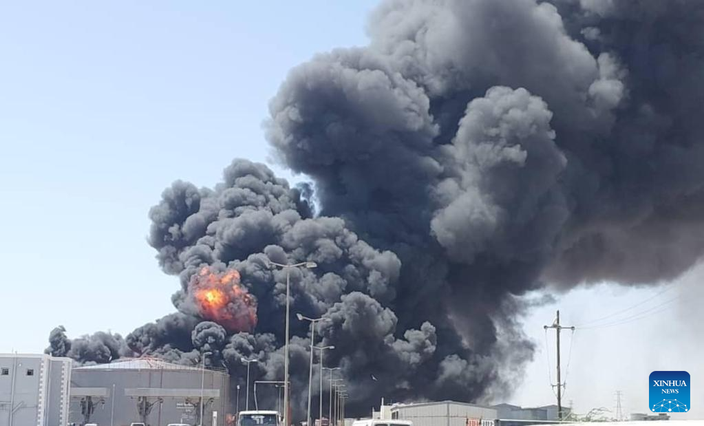 Smoke and fire is seen after a drone attack on a fuel depot in Port Sudan, eastern Sudan, on May 5, 2025. (File photo: Xinhua)