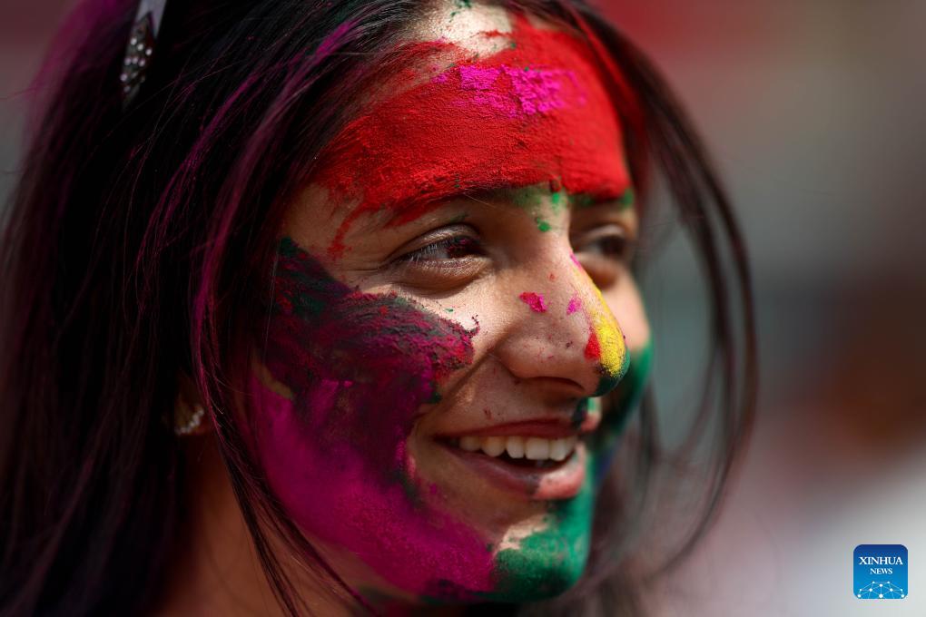 A woman smeared with colored powder is pictured during a celebration of the Holi Festival in Kathmandu, Nepal, on March 2, 2026. Holi, the festival of colors, marks the end of winter and the onset of the spring season. (Photo by Sulav Shrestha/Xinhua)
