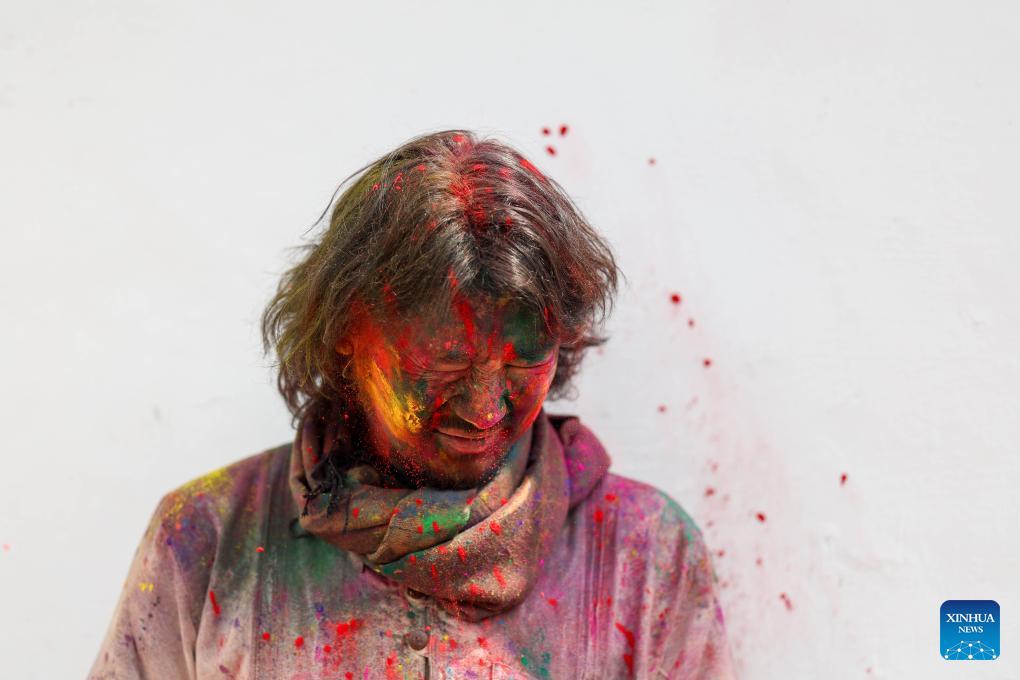 A man smeared with colored powder is pictured during a celebration of the Holi Festival in Kathmandu, Nepal, on March 2, 2026. Holi, the festival of colors, marks the end of winter and the onset of the spring season. (Photo by Sulav Shrestha/Xinhua)