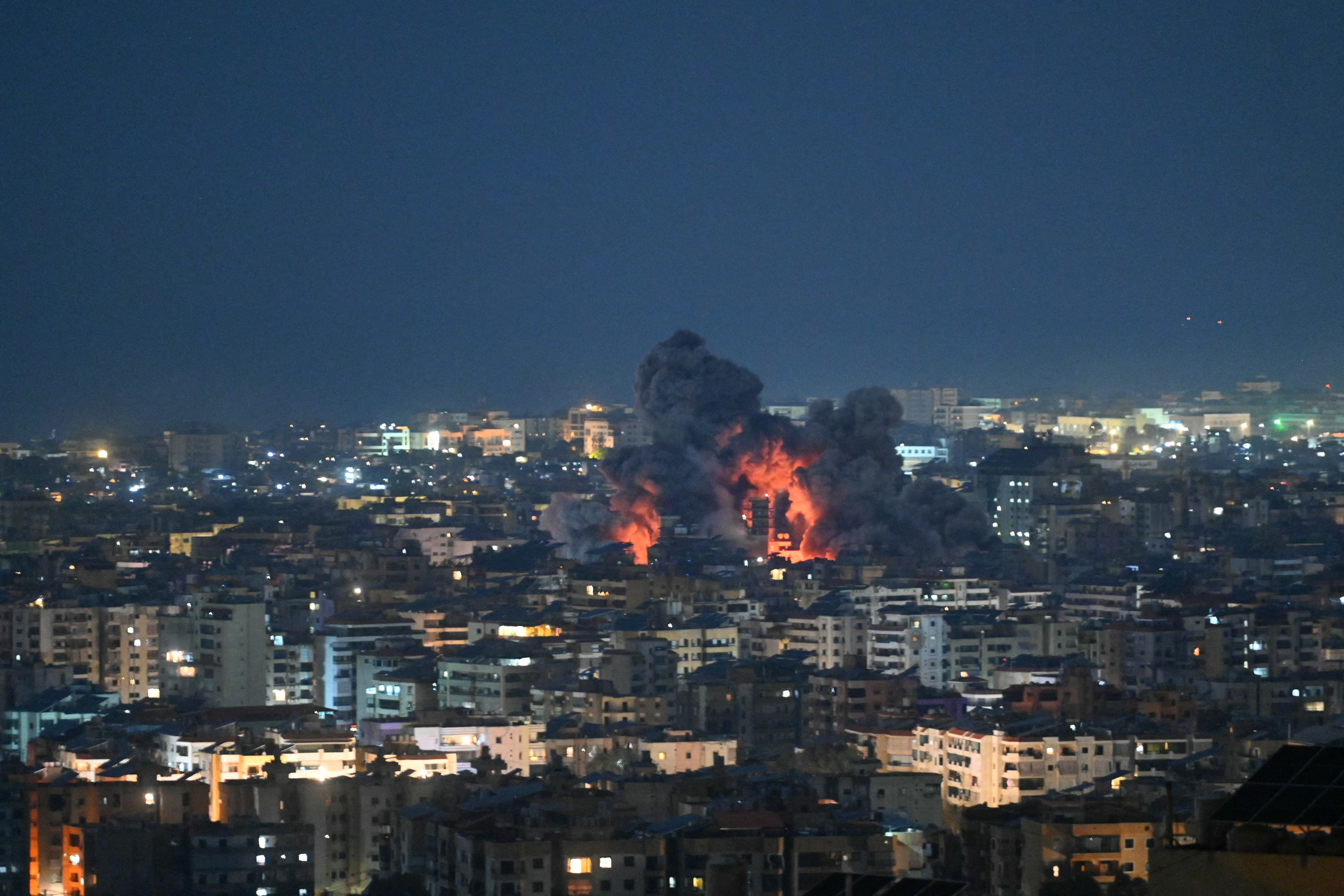 Fire blazes and black smoke rises from the site of an Israeli airstrike that targeted the office of the Hezbollah affiliated Al-Manar TV station in Beirut's southern suburb of Haret Hreik on March 3, 2026.