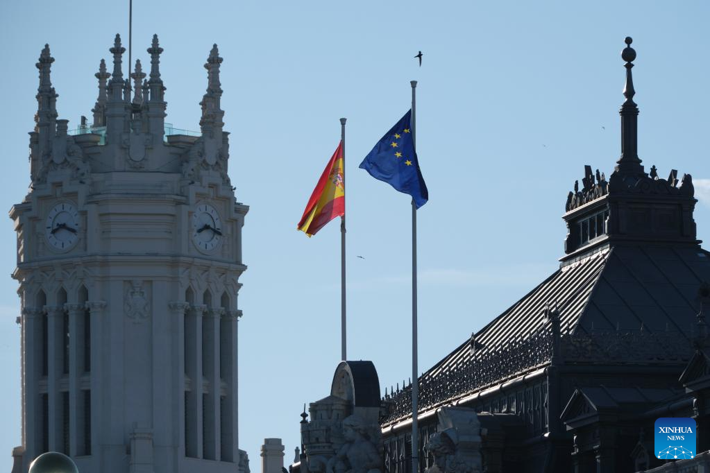 This photo taken on July 1, 2023 shows a flag of the European Union (EU) juxtaposed with a Spanish national flag in downtown Madrid, Spain. (File photo: Xinhua)