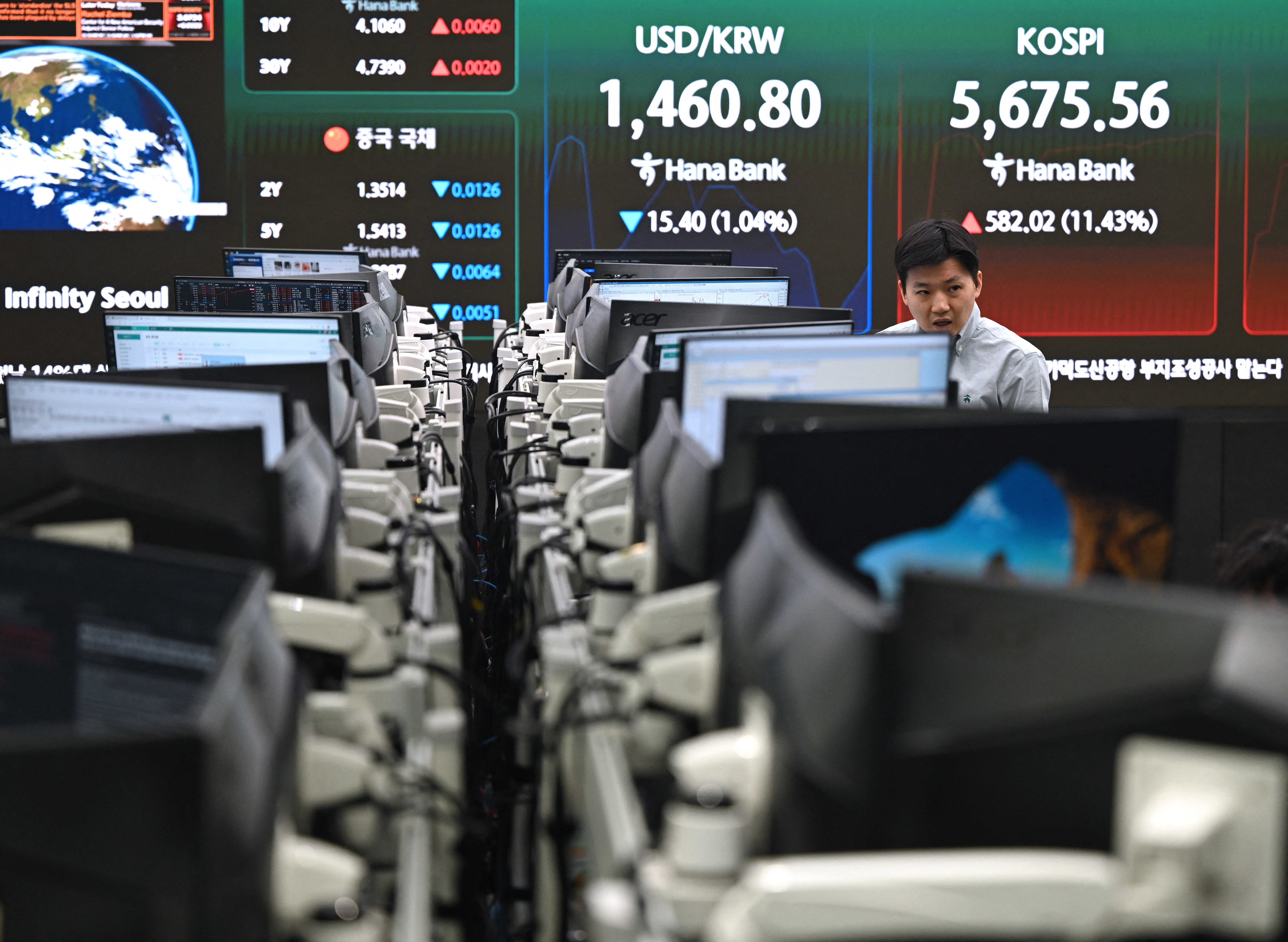 A currency dealer monitors exchange rates in a foreign exchange dealing room at the Hana Bank headquarters in Seoul on March 5, 2026. (Photo: AFP)