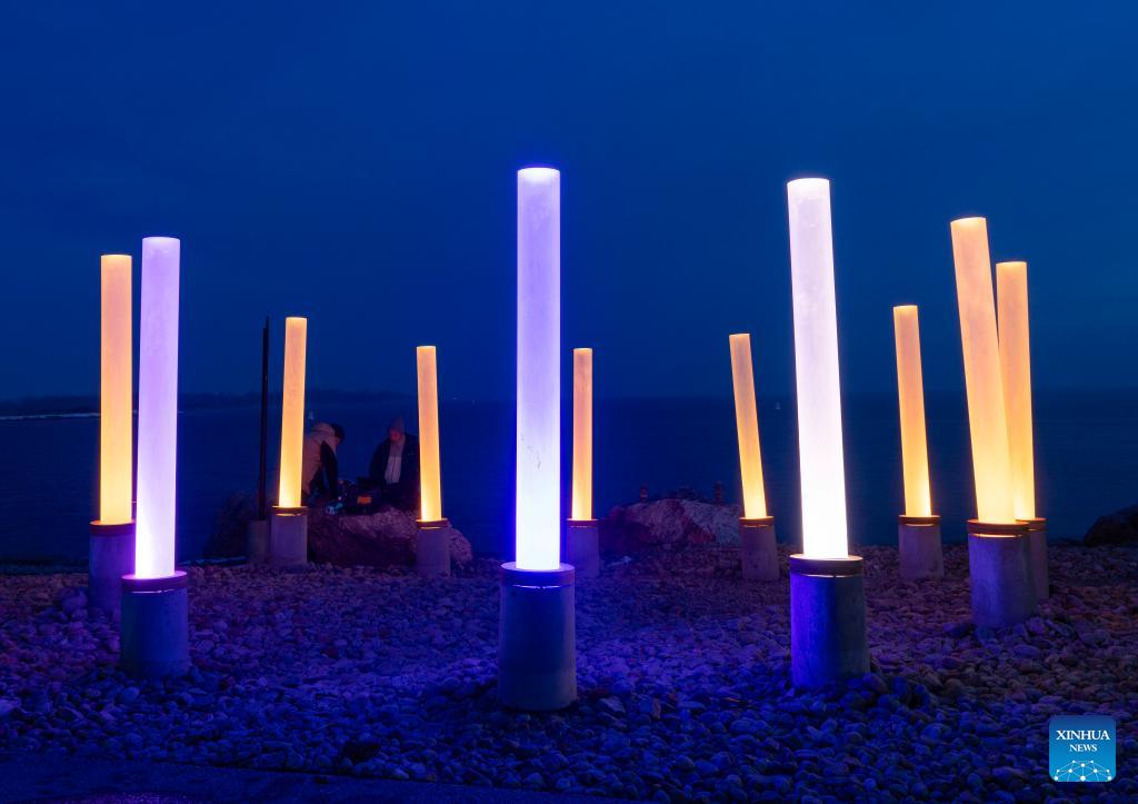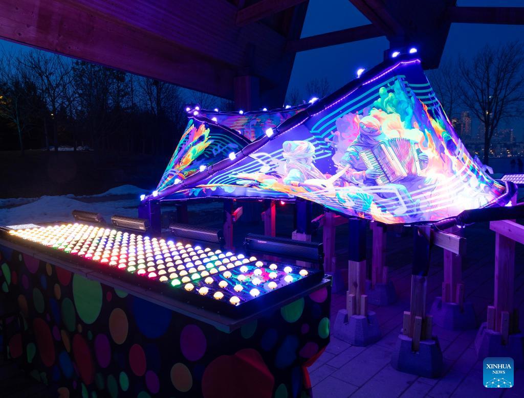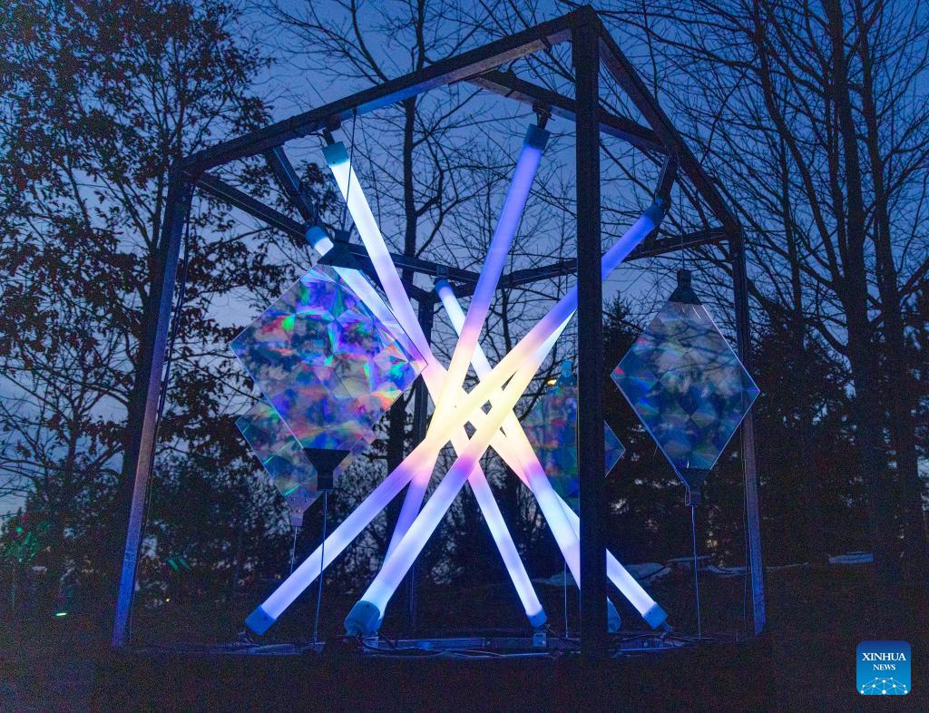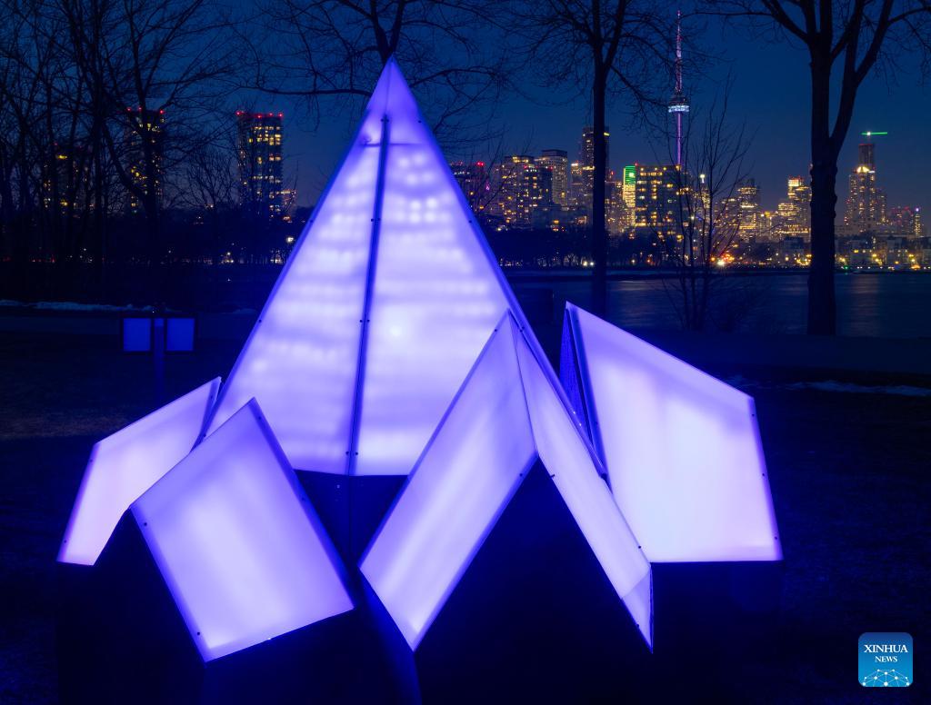 A light art installation is seen during the "Lumiere: The Art of Light" exhibition in Toronto, Canada, on March 4, 2026. The annual outdoor light exhibition is held here from Feb. 16 to March 27. (Photo by Zou Zheng/Xinhua)