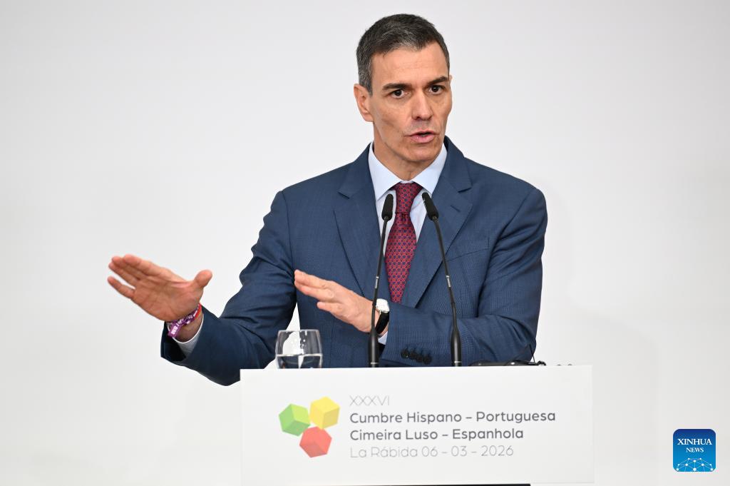 Spanish Prime Minster Pedro Sanchez speaks during a press conference following the Spain-Portugal summit in La Rabida, Huelva, Spain, March 6, 2026. Spanish Prime Minster Pedro Sanchez said on Friday that the U.S.-Israeli military action against Iran is an "extraordinary mistake" and rejected criticism from U.S. President Donald Trump for Spain's refusal to allow the U.S. to use its bases in the country in the ongoing aerial assault. (Photo: Xinhua)