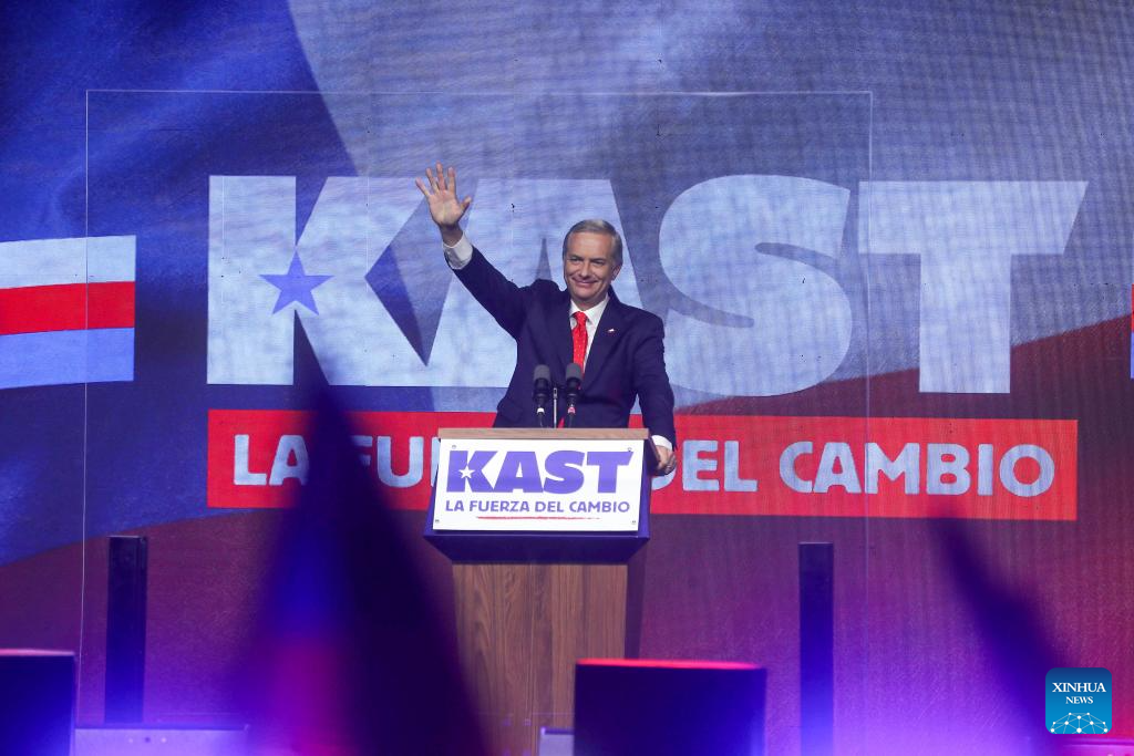 This file photo taken on Nov. 16, 2025 shows Jose Antonio Kast, candidate of Chilean far-right Republican Party, speaking after confirming his entry into the second round of the presidential election, in Santiago, Chile. Jose Antonio Kast won the Chilean presidential runoff election, becoming the country's new president, said the electoral authorities on Sunday. (Photo: Xinhua)