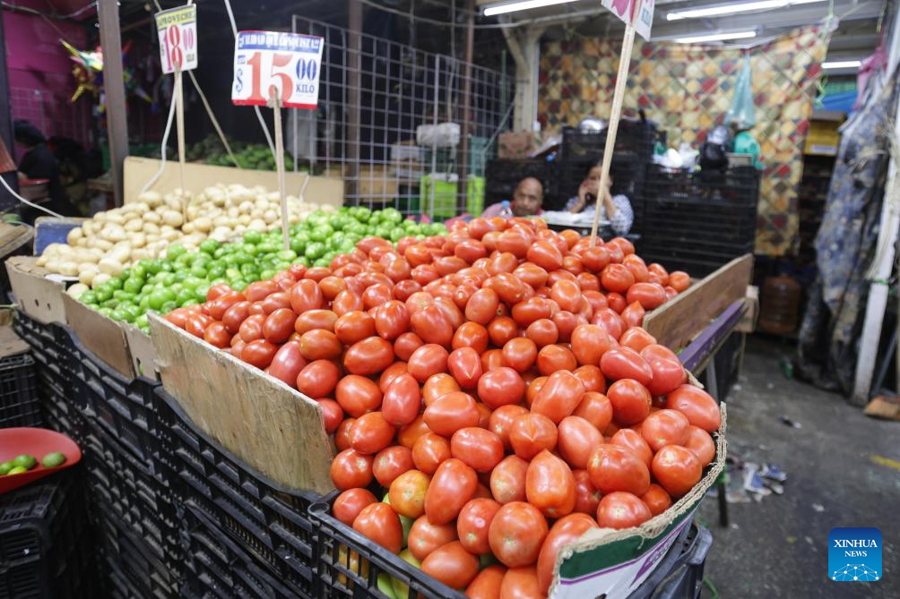 Tomatoes are pictured at a stall in a public market in Mexico City, capital of Mexico, July 14, 2025. (File photo: Xinhua)