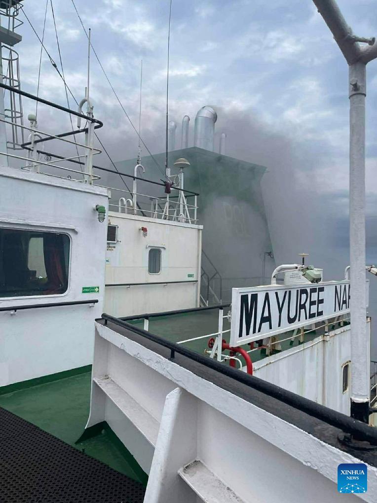 A fire breaks out on a Thai cargo ship after it was struck in the Strait of Hormuz on March 11, 2026. A Thai cargo ship came under attack on Wednesday while sailing in the Strait of Hormuz, said the Royal Thai Navy. So far, 20 crew members have been rescued and taken to Oman for settlement. (Photo: Royal Thai Navy/Handout via Xinhua)
