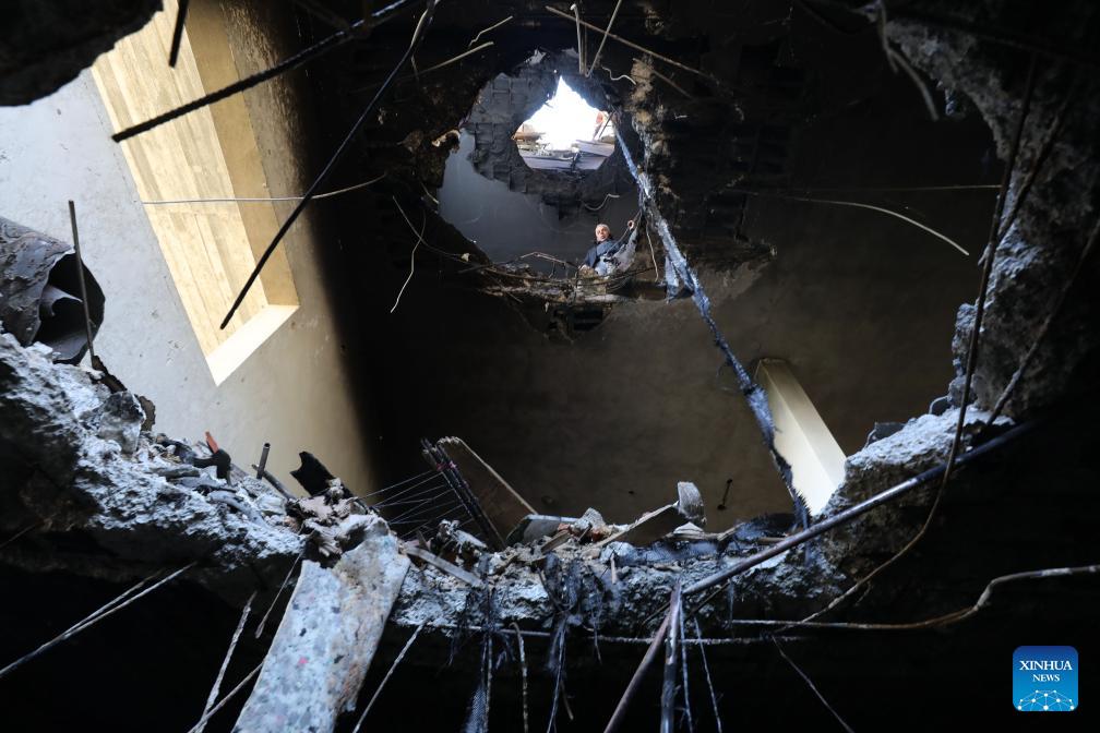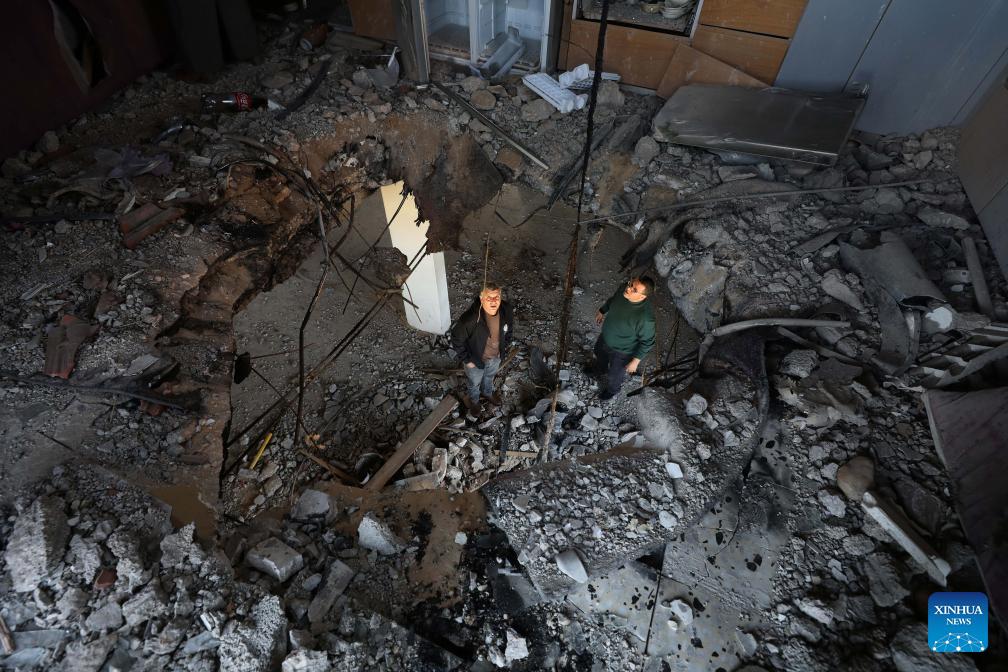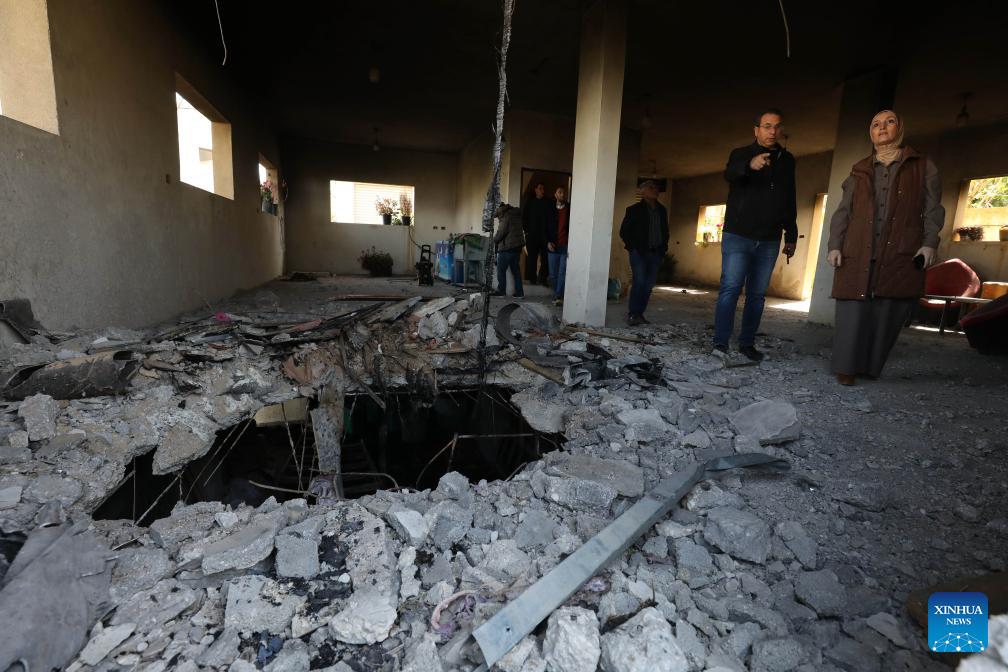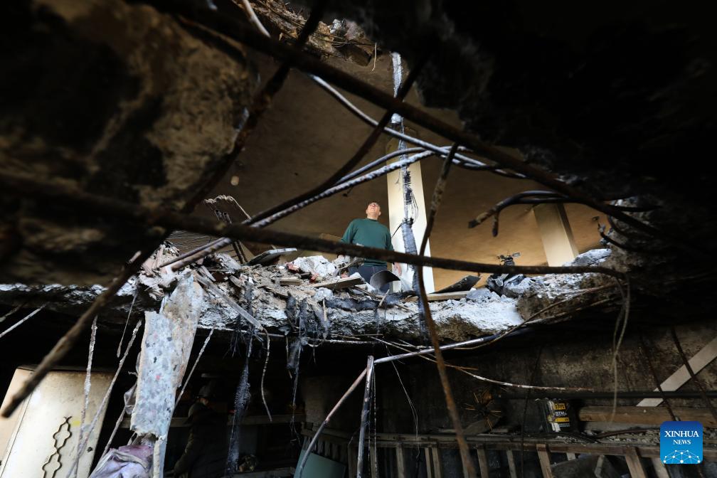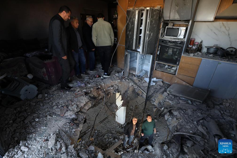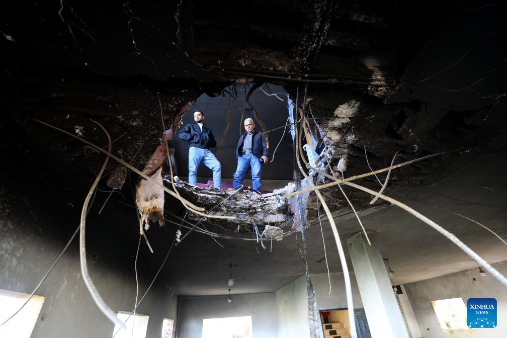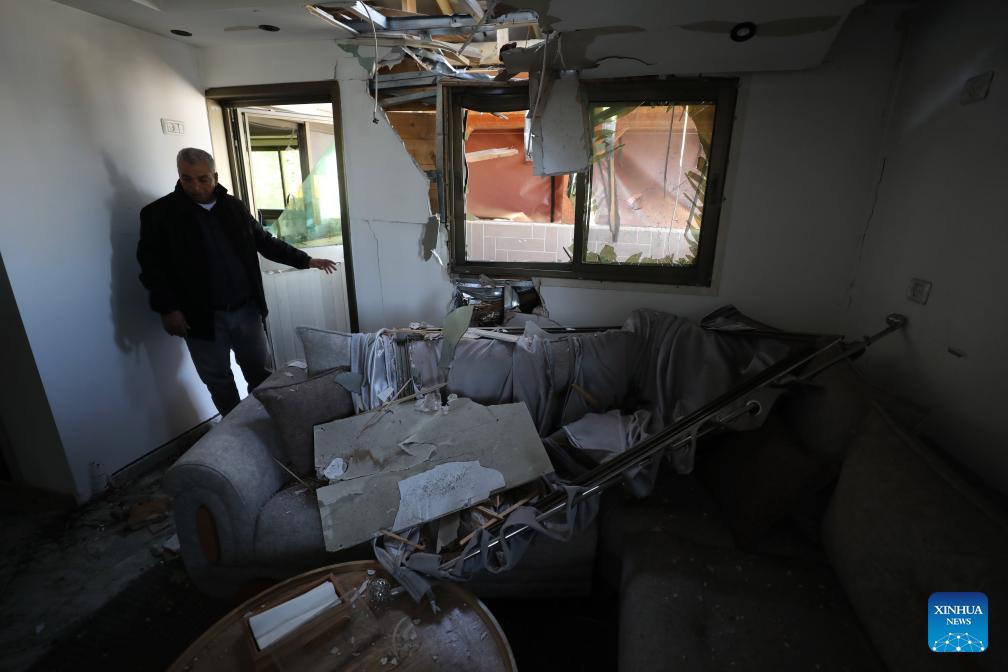 This photo taken on March 11, 2026 shows the damage caused to a building by rocket debris, in the Salfit area in the West Bank. (Photo by Nidal Eshtayeh/Xinhua)