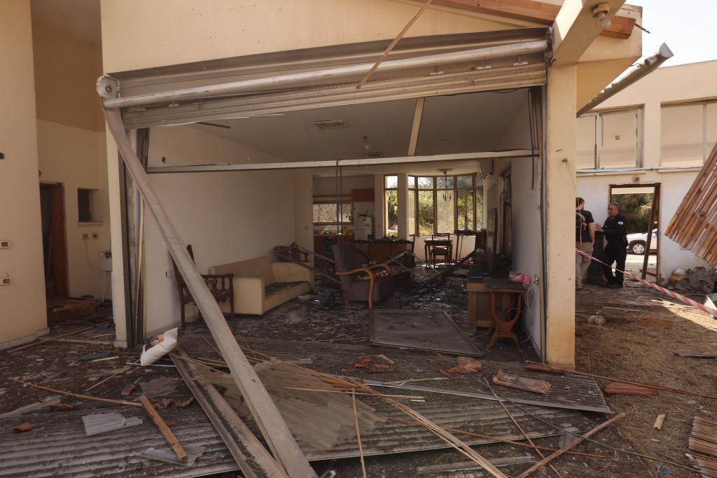 This photo taken on March 12, 2026 shows a house damaged by a projectile launched from Lebanon, in Haniel, central Israel. Iran's Islamic Revolution Guard Corps (IRGC) acknowledged joint operation with Hezbollah against Israel. (Photo by Gil Cohen Magen/Xinhua)