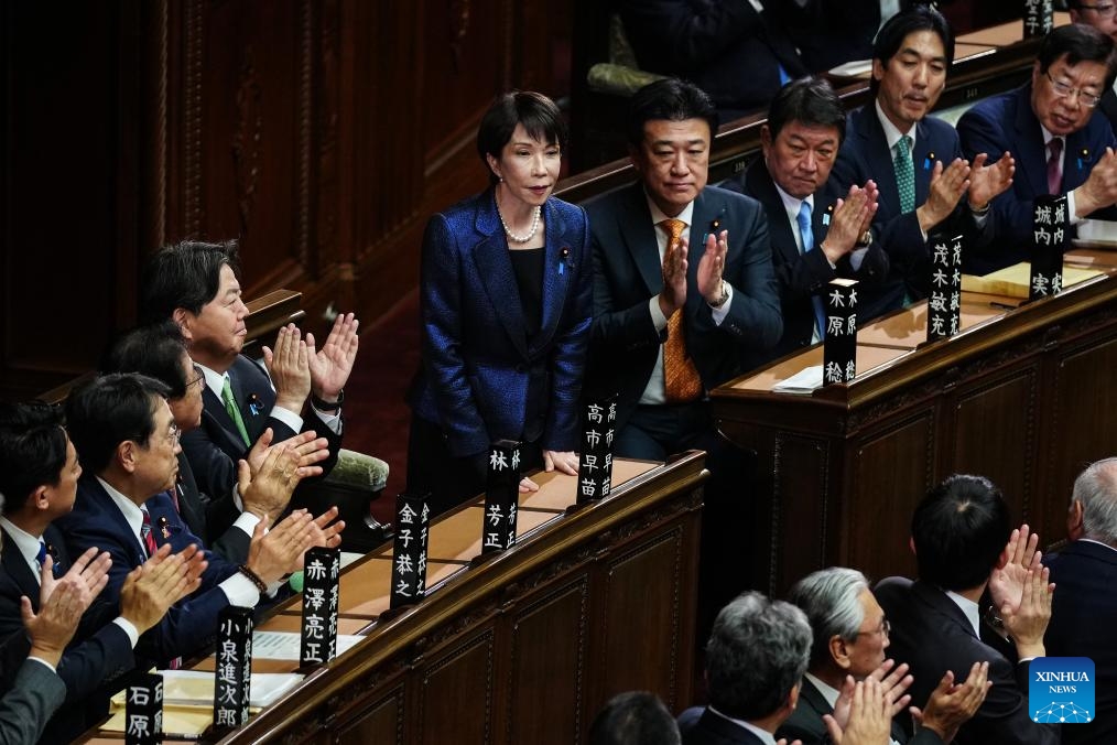 Sanae Takaichi (C) stands after winning Japan's prime ministerial designation vote in the House of Representatives in Tokyo, Japan, Feb. 18, 2026. (Photo: Xinhua)