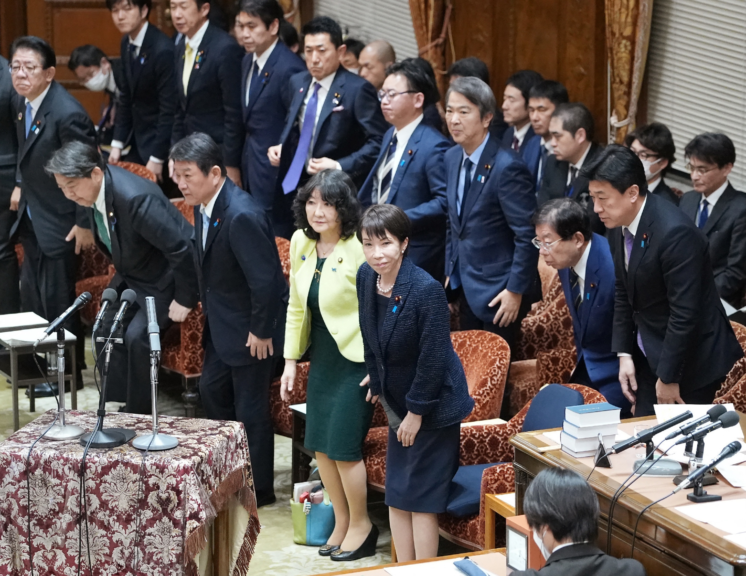 Japan's Prime Minister Sanae Takaichi (front C) and cabinet ministers bow after the government's fiscal 2026 budget bill was approved by the Budget Committee of House of Representatives at Parliament in Tokyo on March 13, 2026. (Photo: AFP)