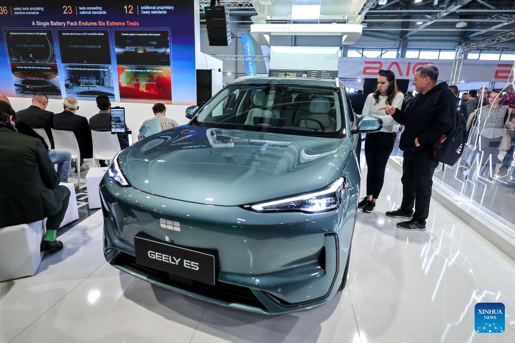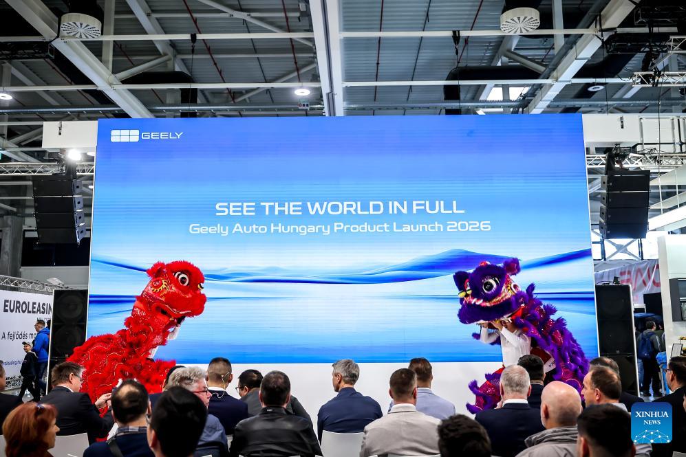 People visit the booth of Chinese car brand Geely during the International Automobile and Tuning Show in Budapest, Hungary, March 13, 2026. The International Automobile and Tuning Show kicked off on Friday, with the participation of several Chinese car brands. (Photo by David Balog/Xinhua)