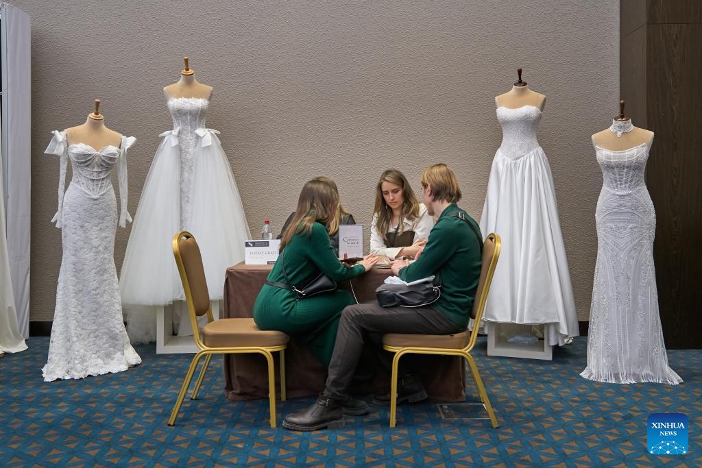A young couple seeks wedding consultations at a wedding expo in St. Petersburg, Russia, March 15, 2026. Dozens of wedding service providers showcase a range of wedding-related services at the wedding expo, including bridal makeup, wedding hosting, wedding photography, wedding planning and so on. (Photo by Guo Feizhou/Xinhua)