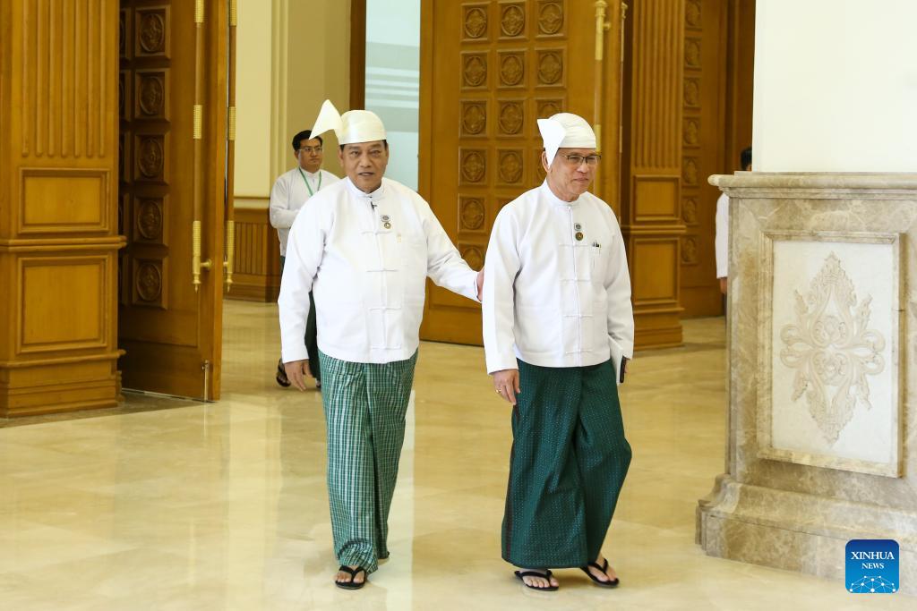 U Khin Yi (L), chairman of the Union Solidarity and Development Party (USDP), attends the first session of the third Pyithu Hluttaw (Lower House) in Nay Pyi Taw, Myanmar, March 16, 2026. U Khin Yi, a member of parliament from the USDP, was elected as the new Speaker of Myanmar's Pyithu Hluttaw in a parliament session held in Nay Pyi Taw on Monday, according to state-owned Myanmar Radio and Television. (Photo by Ei Mon Kyaw/Xinhua)