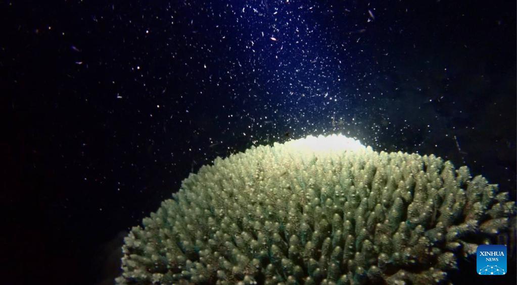 This photo taken in March 2026 shows coral spawning in Cambodian waters. A conservationist group has spotted coral spawning events for the first time on Song Saa Island in Preah Sihanouk province and in Koh Sdach Archipelago in Koh Kong province in southwest Cambodia, said a joint press release on Monday. (Anna Sabrina Petry/Fauna & Flora/Handout via Xinhua)