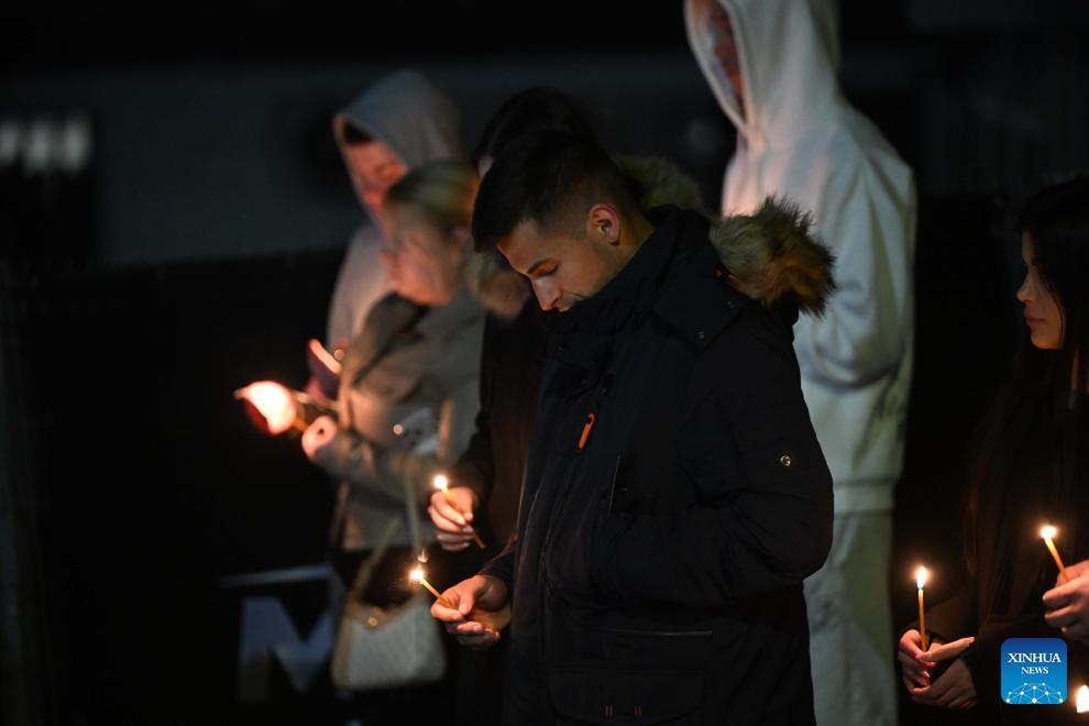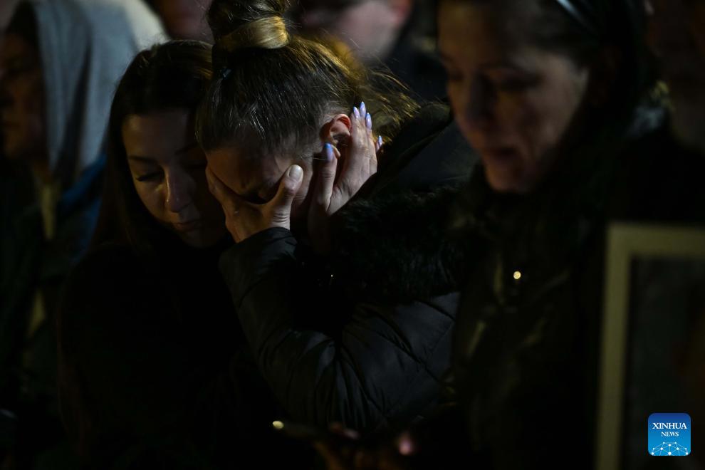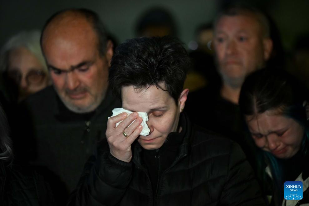 People mourn during a commemoration marking the one-year anniversary of a nightclub fire in Kocani, North Macedonia, March 16, 2026. On March 16, 2025, a nightclub fire claimed the lives of 63 individuals and injured over 100 others. (Photo by Tomislav Georgiev/Xinhua)