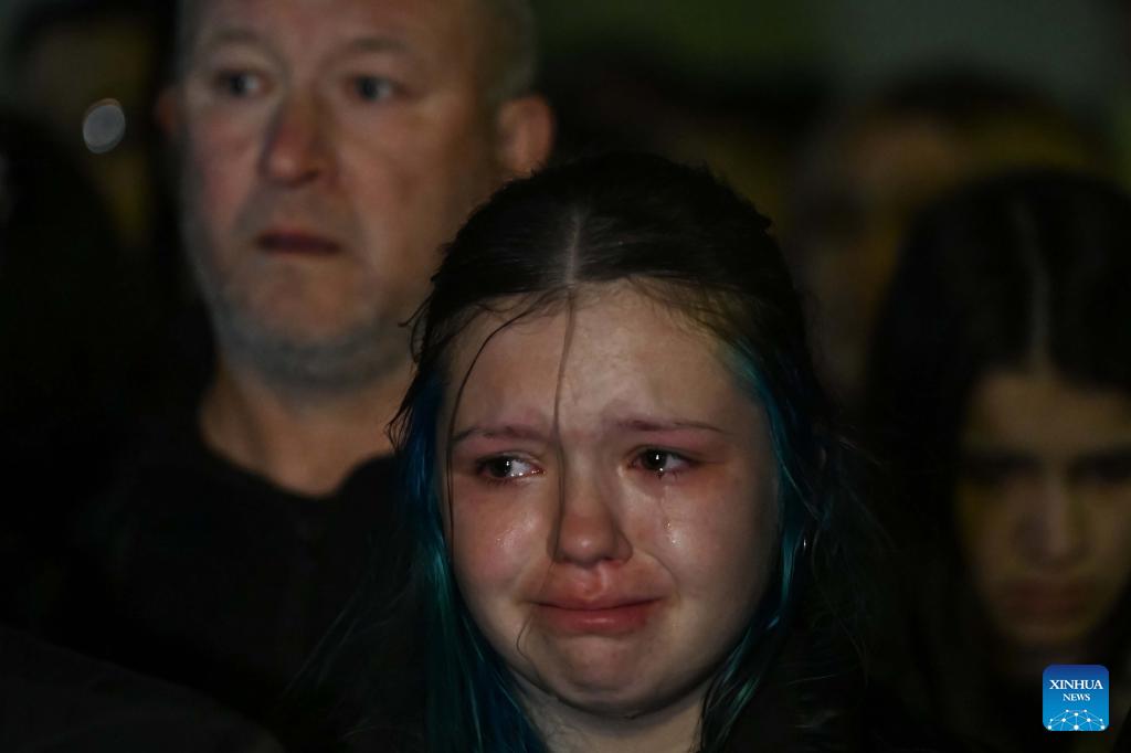 A girl weeps during a commemoration marking the one-year anniversary of a nightclub fire in Kocani, North Macedonia, March 16, 2026. On March 16, 2025, a nightclub fire claimed the lives of 63 individuals and injured over 100 others. (Photo by Tomislav Georgiev/Xinhua)