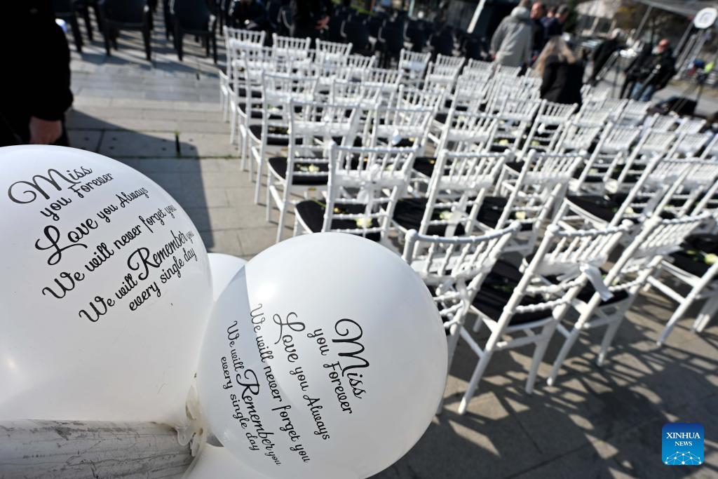 63 white chairs, symbolizing 63 victims, are displayed during a commemoration marking the one-year anniversary of a nightclub fire in Kocani, North Macedonia, March 16, 2026. On March 16, 2025, a nightclub fire claimed the lives of 63 individuals and injured over 100 others. (Photo by Tomislav Georgiev/Xinhua)