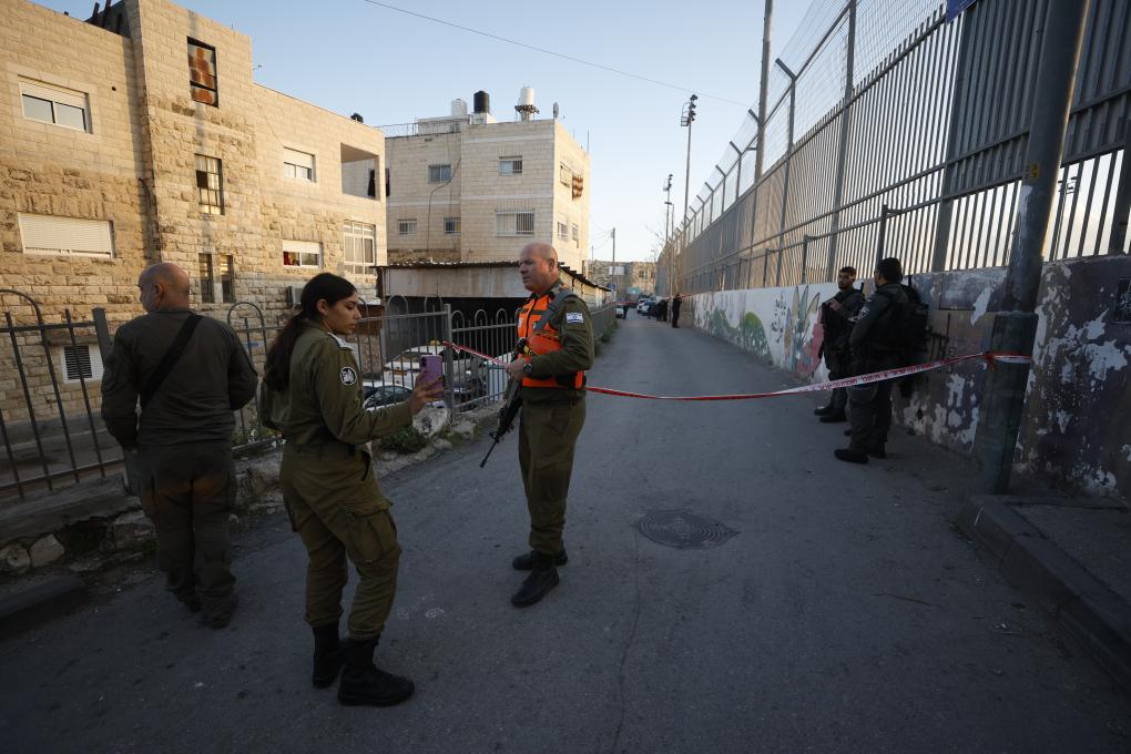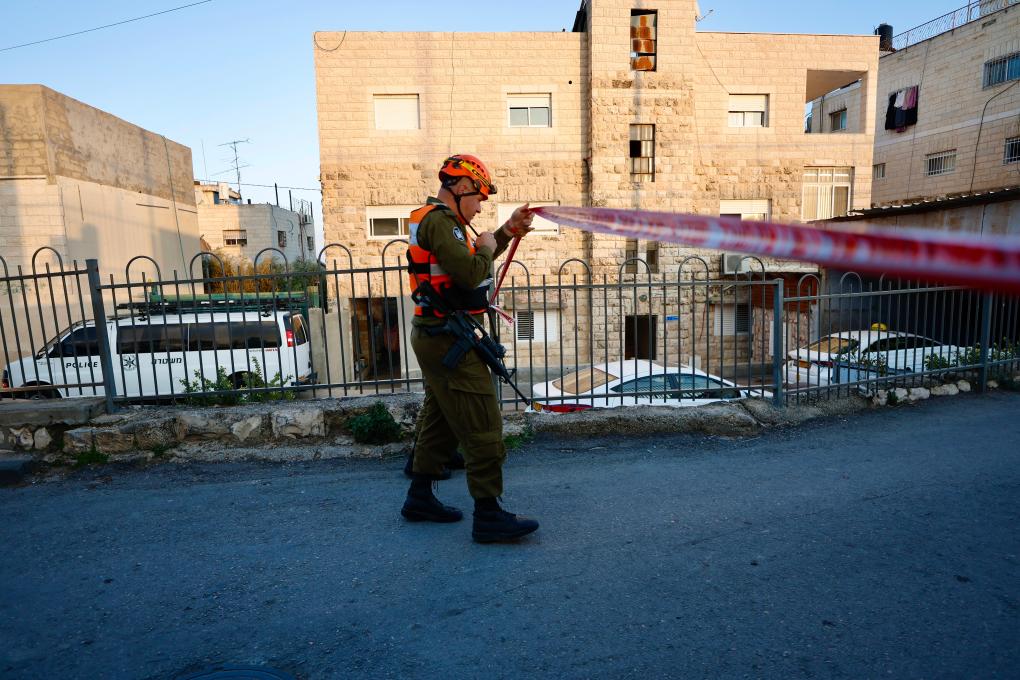 Israeli security forces work at the site influenced by fragments of a missile in east Jerusalem, March 16, 2026. (Photo by Jamal Awad/Xinhua)