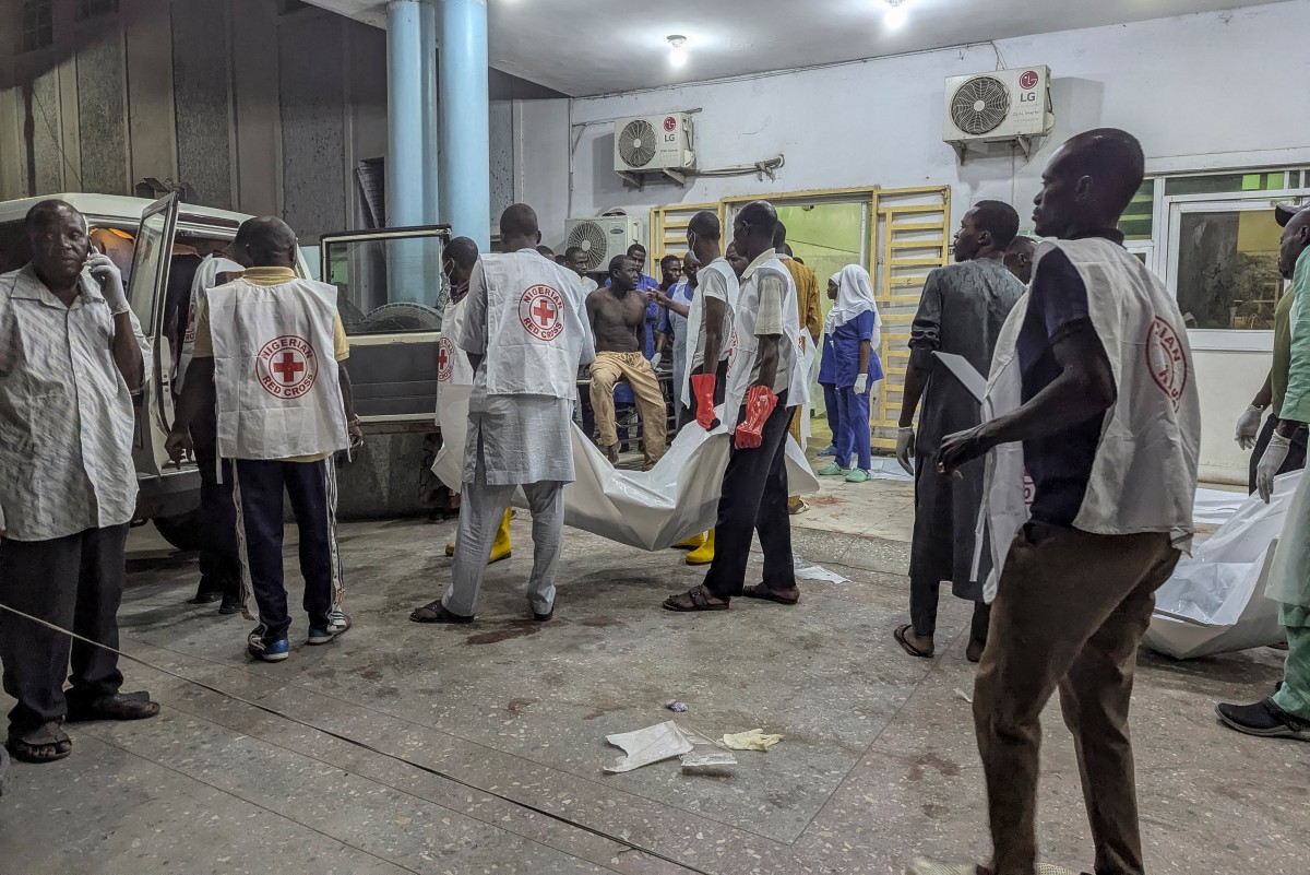 Members of the Nigerian Red Cross carry a body bag at a hospital in Maiduguri on March 16, 2026, following blasts in the city. (Photo: AFP)