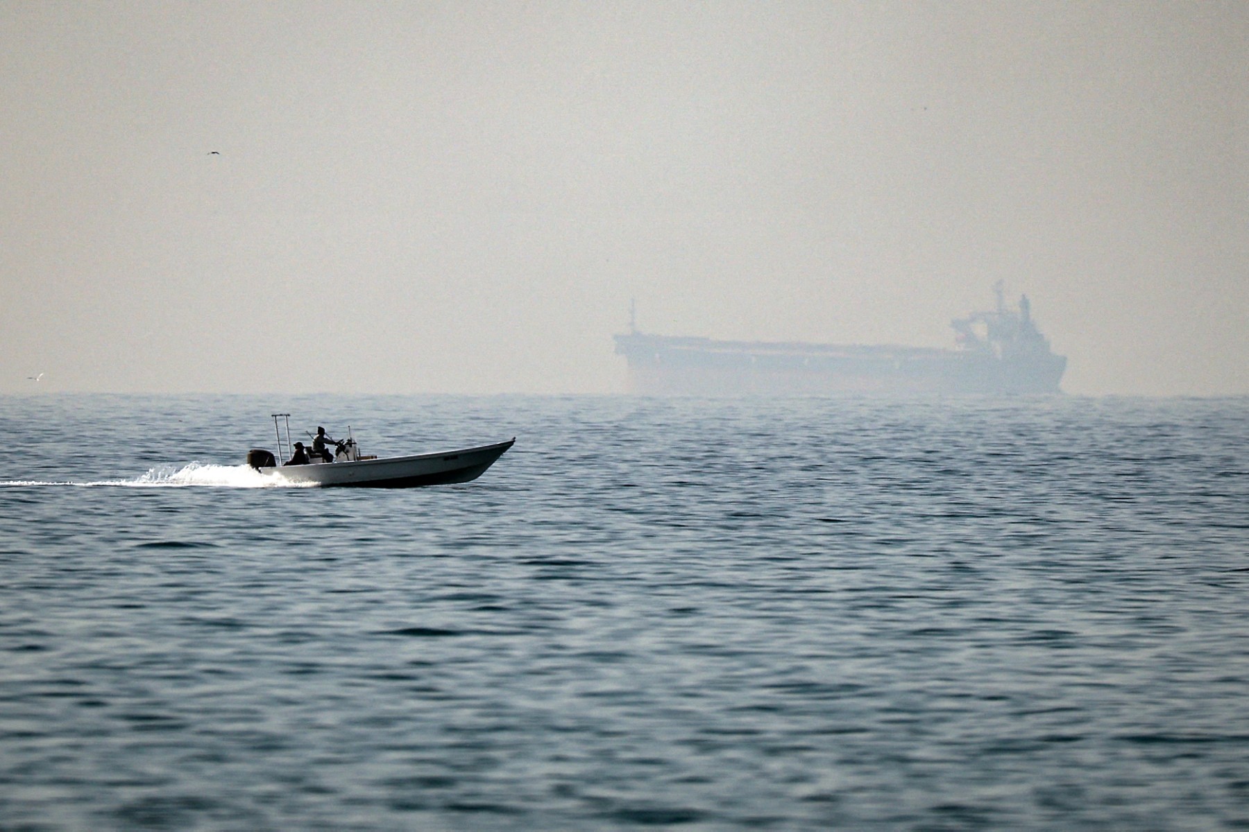 A motorboat cruises along the shore off the town of Al Jeer on the Strait of Hormuz in the northern emirate of Ras Al Khaimah, with a tanker seen in the background, on February 25, 2026. (File photo: AFP)