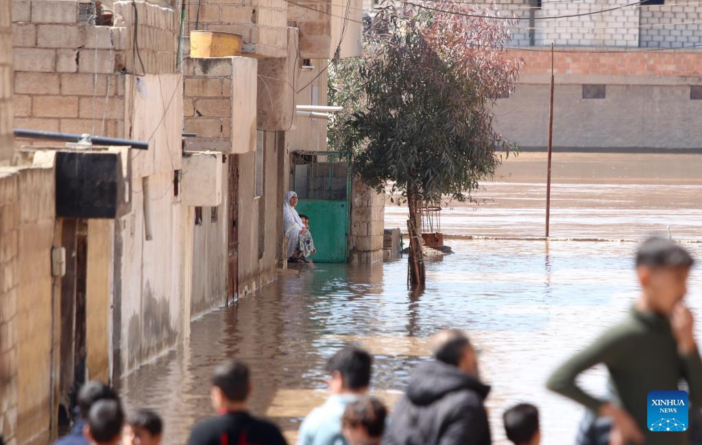 Residents gather near flooded houses in Hasakah, Syria, on March 17, 2026. Heavy rainfall caused the overflow of Khabur River, affecting several neighborhoods in Hasakah. (Str/Xinhua)