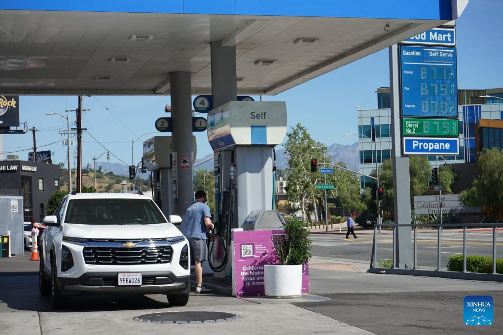 A man refuels his car at a gas station in El Monte, Los Angeles County, California, the United States, March 17, 2026. (Phote by Zeng Hui/Xinhua)