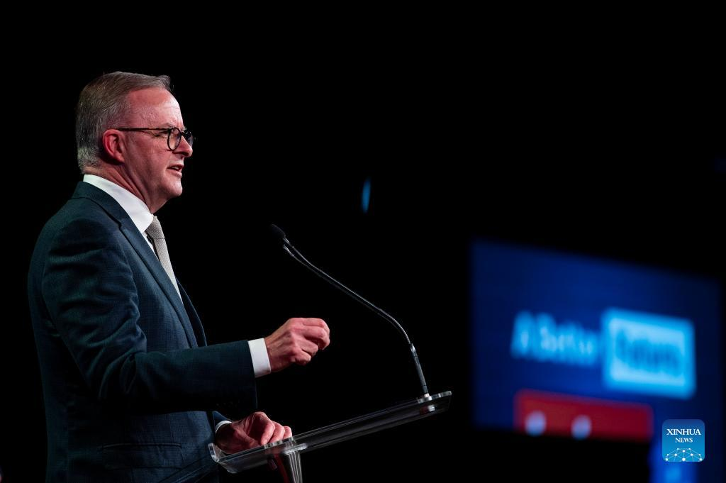 Anthony Albanese speaks to supporters in Sydney, Australia, May 21, 2022. Anthony Albanese has claimed victory for his Labor Party after incumbent Prime Minister Scott Morrison conceded defeat in Australia's 2022 federal election held on Satuday. (Xinhua/Bai Xuefei)