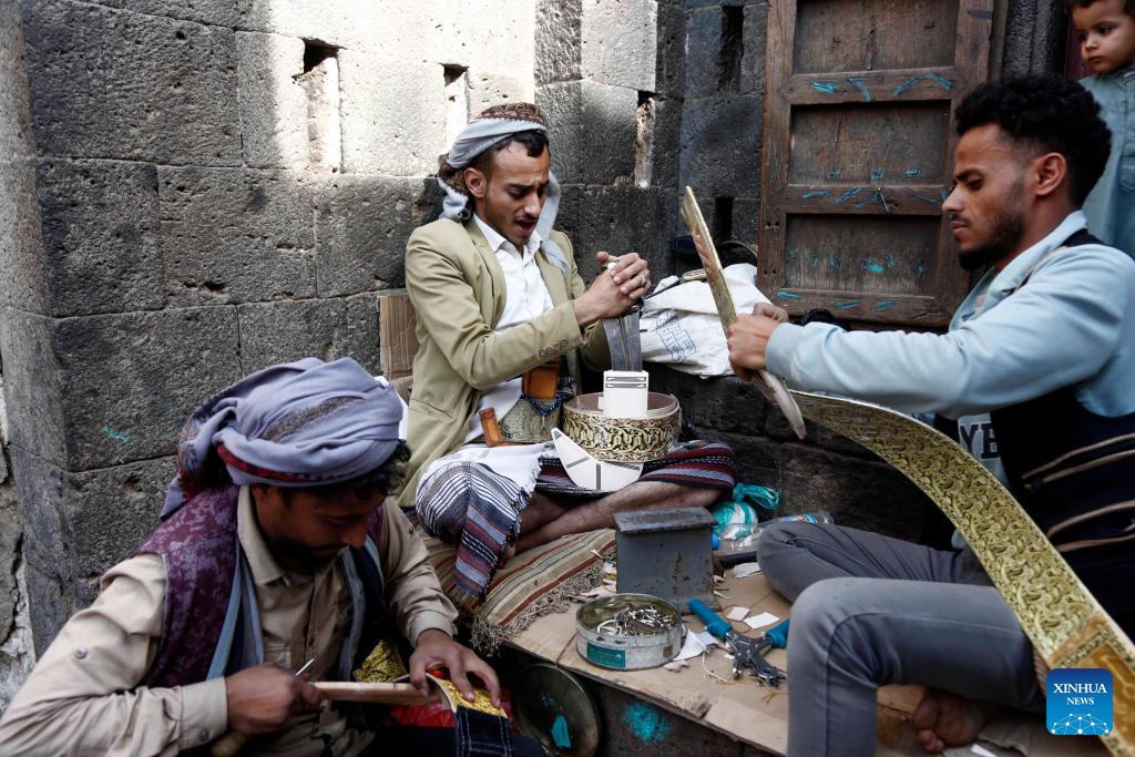 Cobblers work on Jambiya, Yemen's traditional dagger, for customers in preparation for the Eid al-Fitr at a market in the Old City of Sanaa, Yemen, March 18, 2026. (Photo by Mohammed Mohammed/Xinhua)