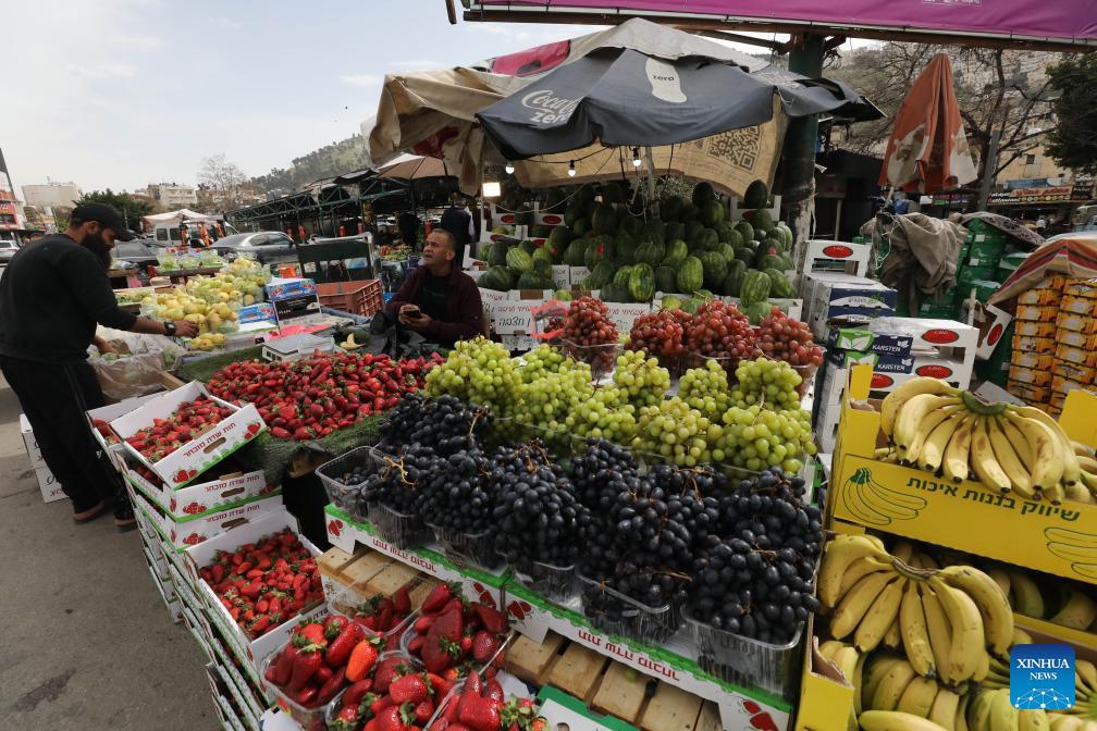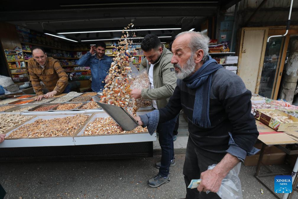 A vendor displays products in a market before Eid al-Fitr in the northern West Bank city of Nablus, on March 18, 2026. (Photo by Nidal Eshtayeh/Xinhua)