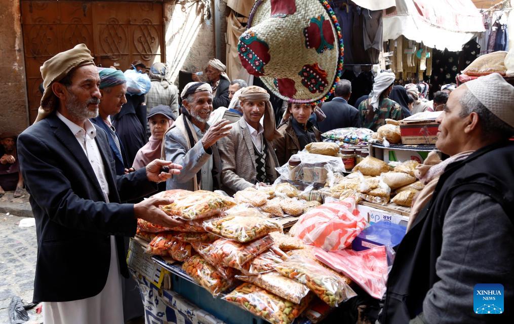 People buy sweets in preparation for the Eid al-Fitr at a market in the Old City of Sanaa, Yemen, March 18, 2026. (Photo by Mohammed Mohammed/Xinhua)