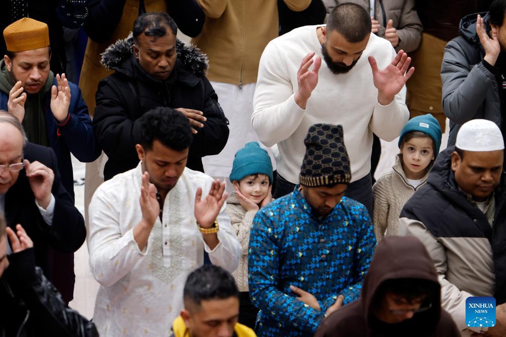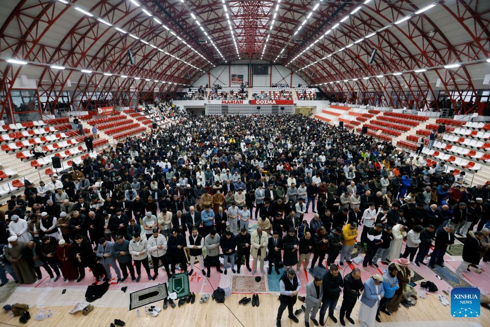 People attend prayers in celebration of Eid al-Fitr in Bucharest, Romania, March 20, 2026. (Photo by Cristian Cristel/Xinhua)