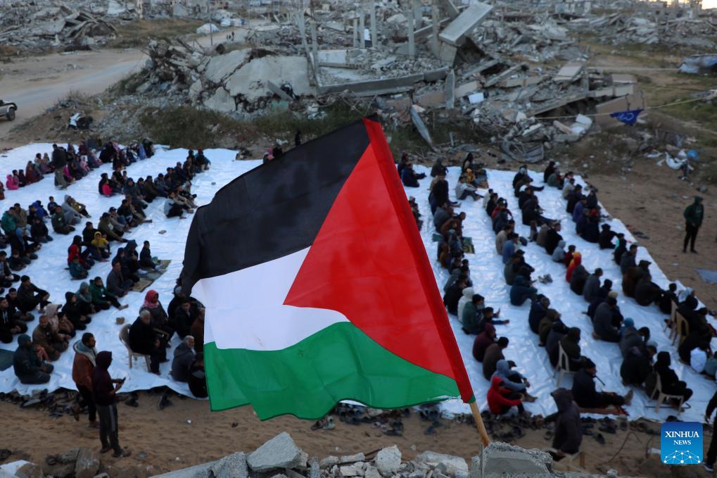 Palestinians perform Eid al-Fitr prayers amid the rubble of destroyed buildings in the Tel al-Hawa neighborhood, southwest of Gaza City, March 20, 2026. (Photo by Rizek Abdeljawad/Xinhua)