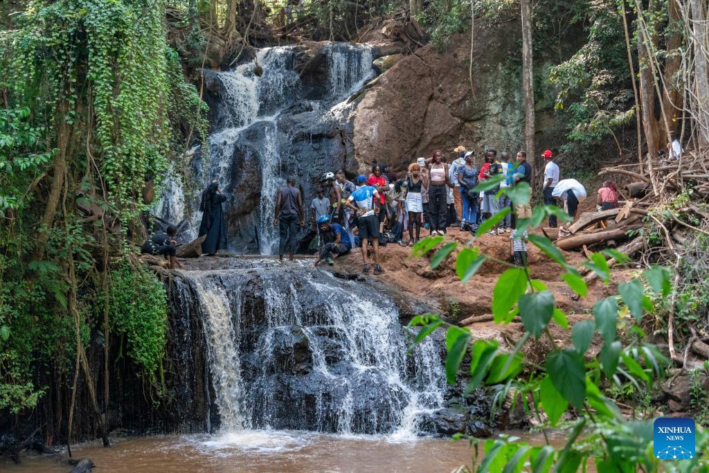 Tourists visit a waterfall in Karura Forest in Nairobi, Kenya, Jan. 25, 2026.