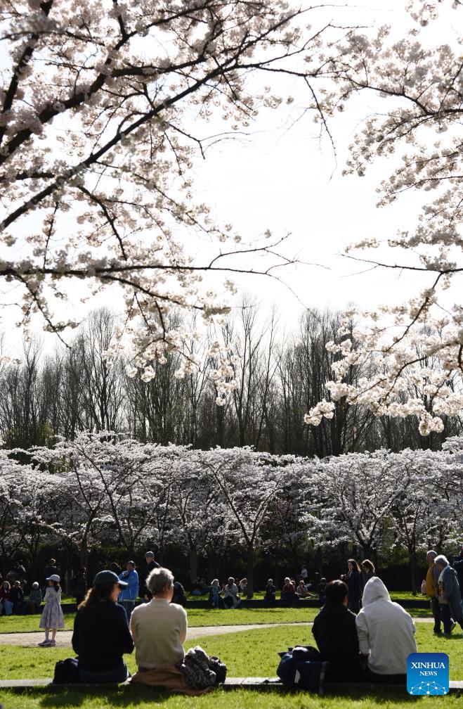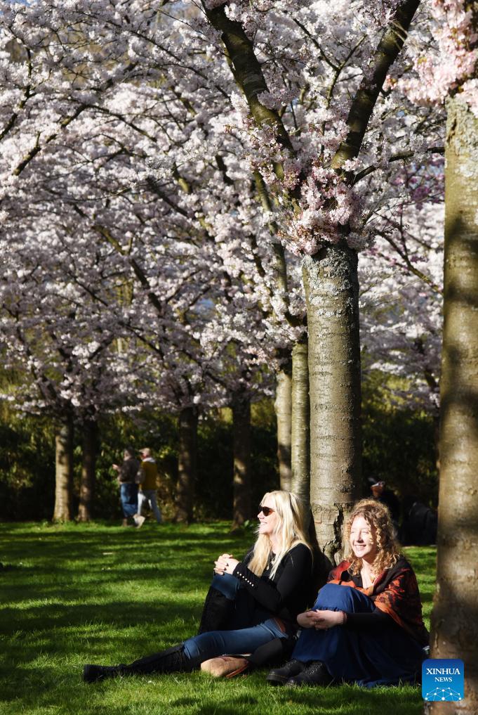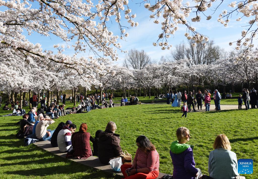 People enjoy spring time under cherry blossoms at a park in Amstelveen, the Netherlands, March 20, 2026. (Xinhua/Shao Haijun)
