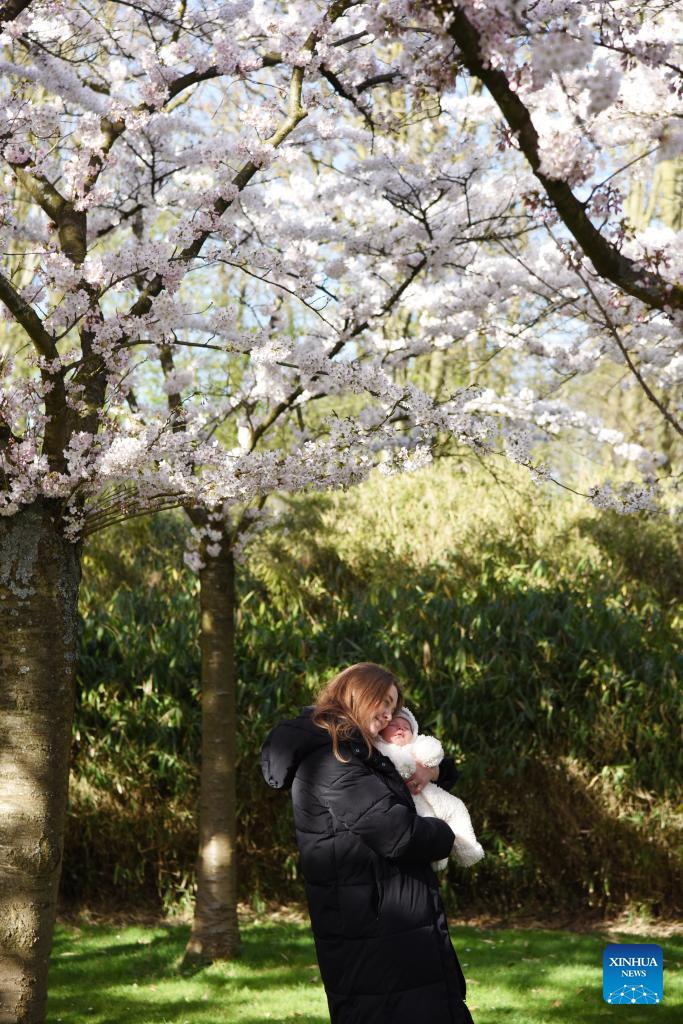 A woman holding her child enjoys spring time under cherry blossoms at a park in Amstelveen, the Netherlands, March 20, 2026. (Xinhua/Shao Haijun)