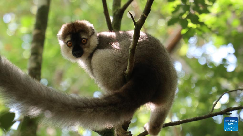 This photo taken on March 19, 2026 shows a brown lemur at Ranomafana National Park in Fianarantsoa Province, Madagascar. The Ranomafana National Park is part of the Rainforests of the Atsinanana (Madagascar), which was inscribed on UNESCO World Heritage List in 2007. In Malagasy, "Ranomafana" means "hot water", reflecting the area's abundant geothermal resources. The park features well-preserved tropical rainforest, notable biodiversity, and a wide range of endemic flora and fauna. (Xinhua/Chen Shaohua)