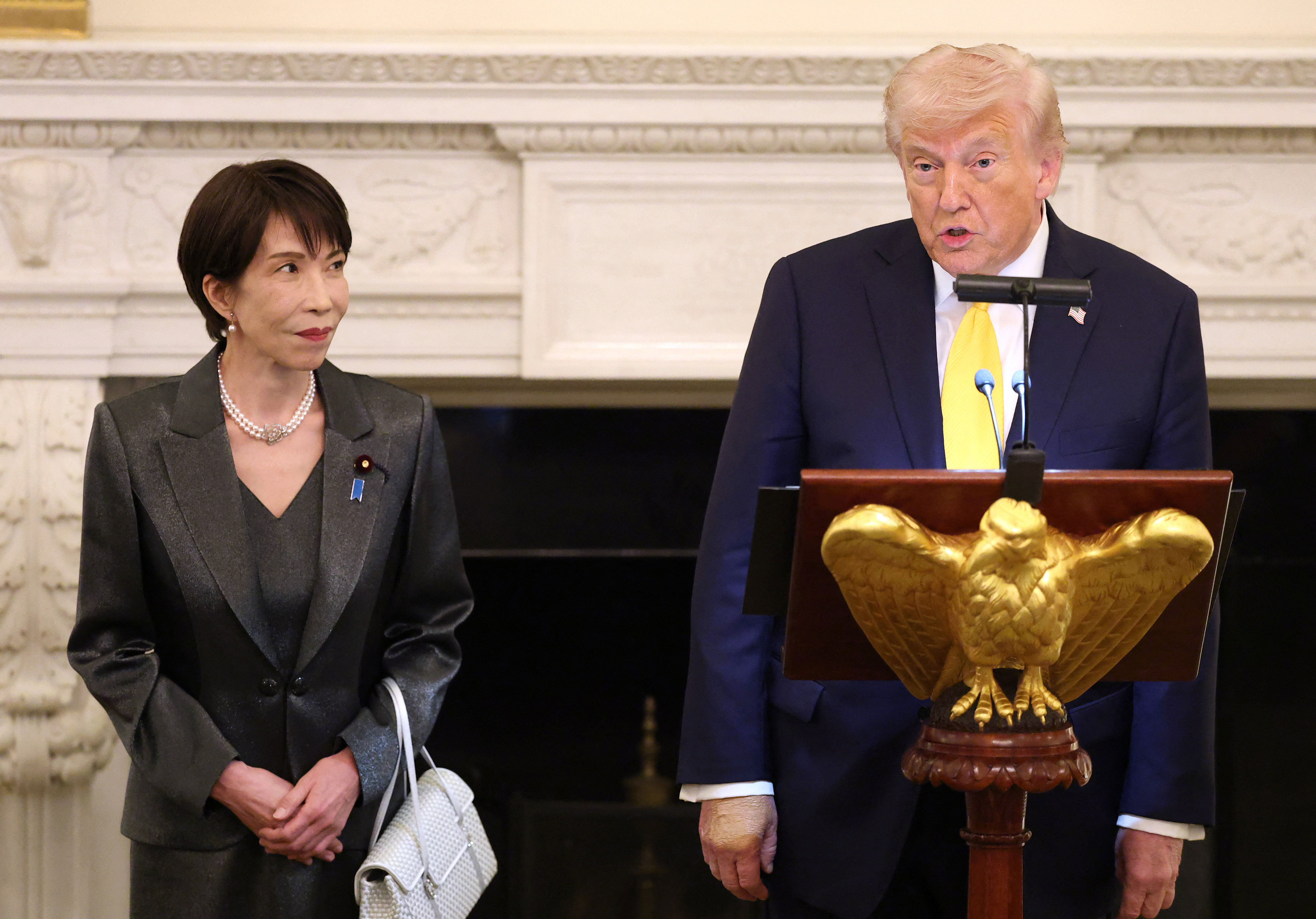 U.S. President Donald Trump speaks as Japanese Prime Minister Sanae Takaichi looks on before a state dinner in the State Dining Room at the White House on March 19, 2026 in Washington, DC. (Photo: AFP)