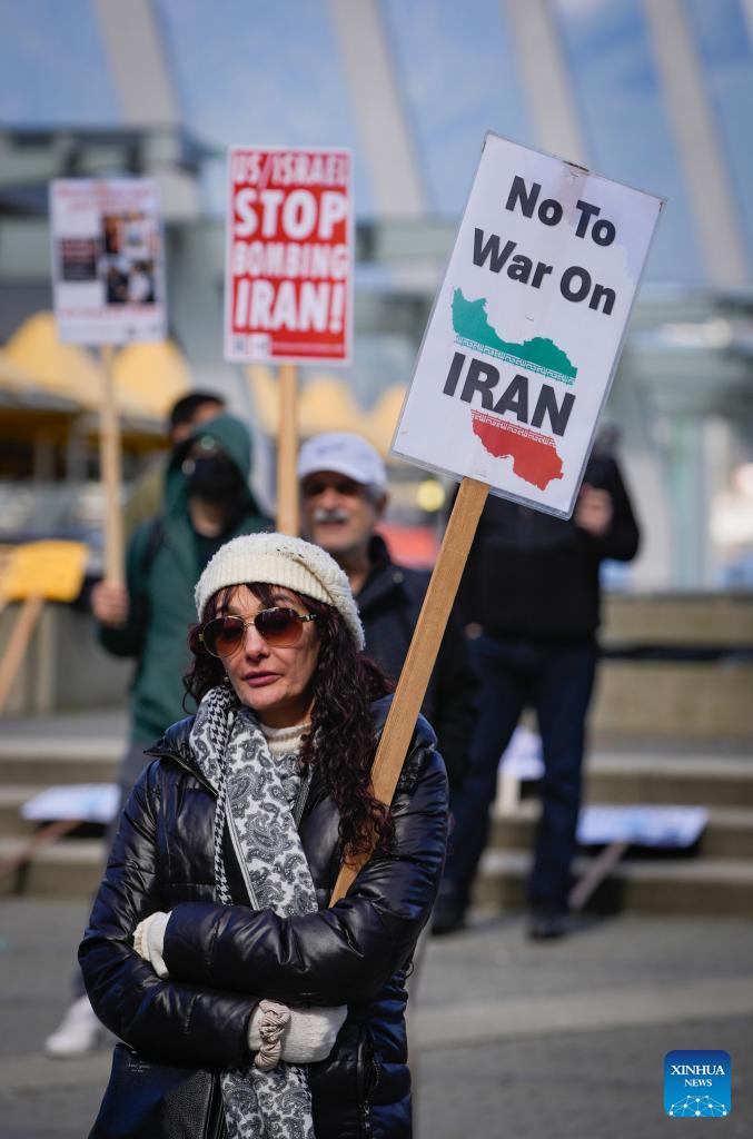 People protest against U.S.-Israeli attacks on Iran in Vancouver, Canada