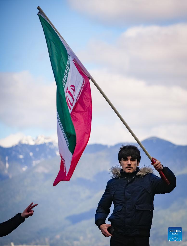 A protester waves an Iranian flag during a rally against U.S.-Israeli attacks on Iran in Vancouver, British Columbia, Canada, March 21, 2026. (Photo by Liang Sen/Xinhua)
